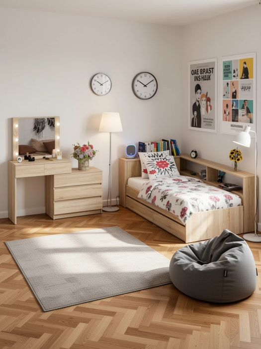 Столик косметический с лампочками 110 и Ксения 900 односпальная кровать с ящиками и прикроватным блоком. Комплектация состоит из столика с лампочками и односпальной кровати с выдвижными ящиками и прикроватным блоком.