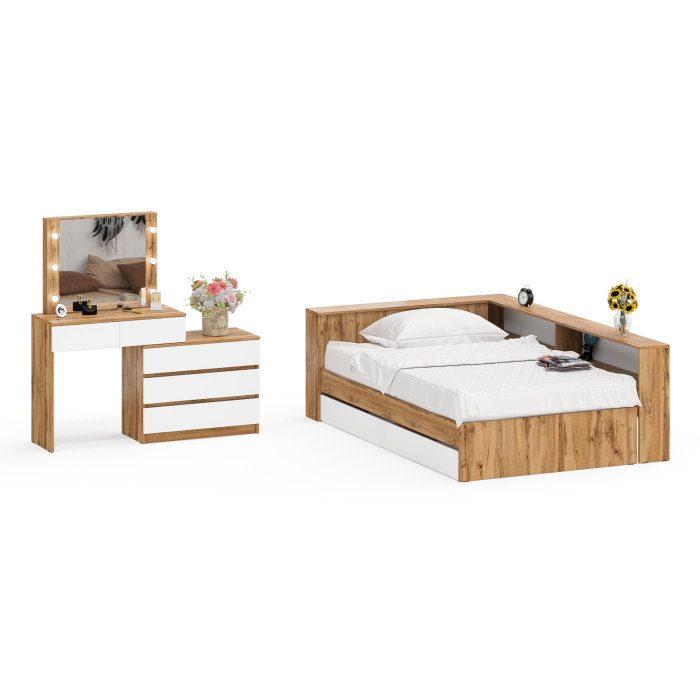 Отзывы о Столплит Туалетный столик для спальни с подсветкой 110 и Ксения кровать 1200 с ящиками и прикроватный блок Белый/Дуб вотан