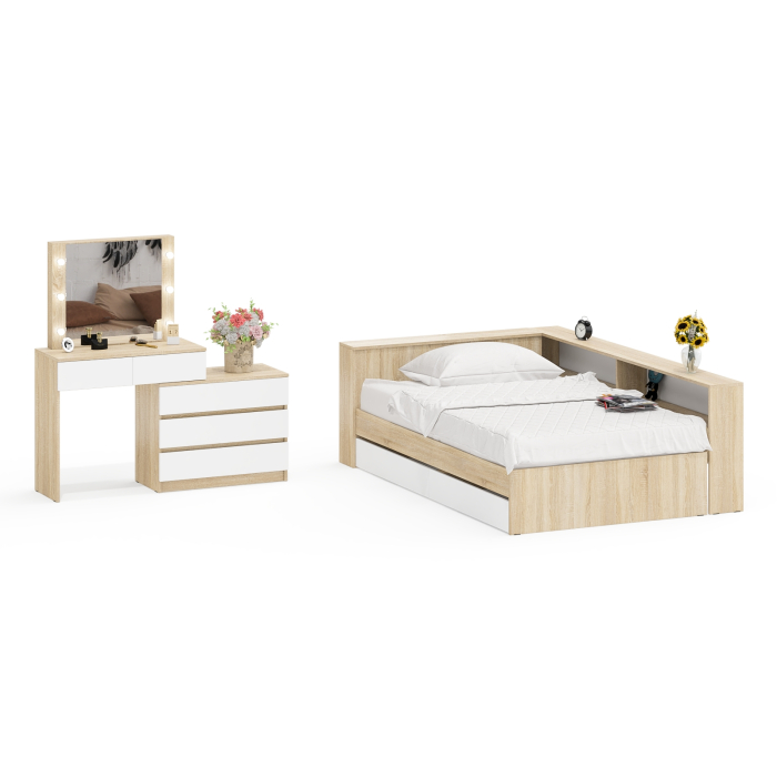 Отзывы о Столплит Туалетный столик для спальни с подсветкой 110 и Ксения кровать 1200 с ящиками и прикроватный блок Дуб Сонома, Белый