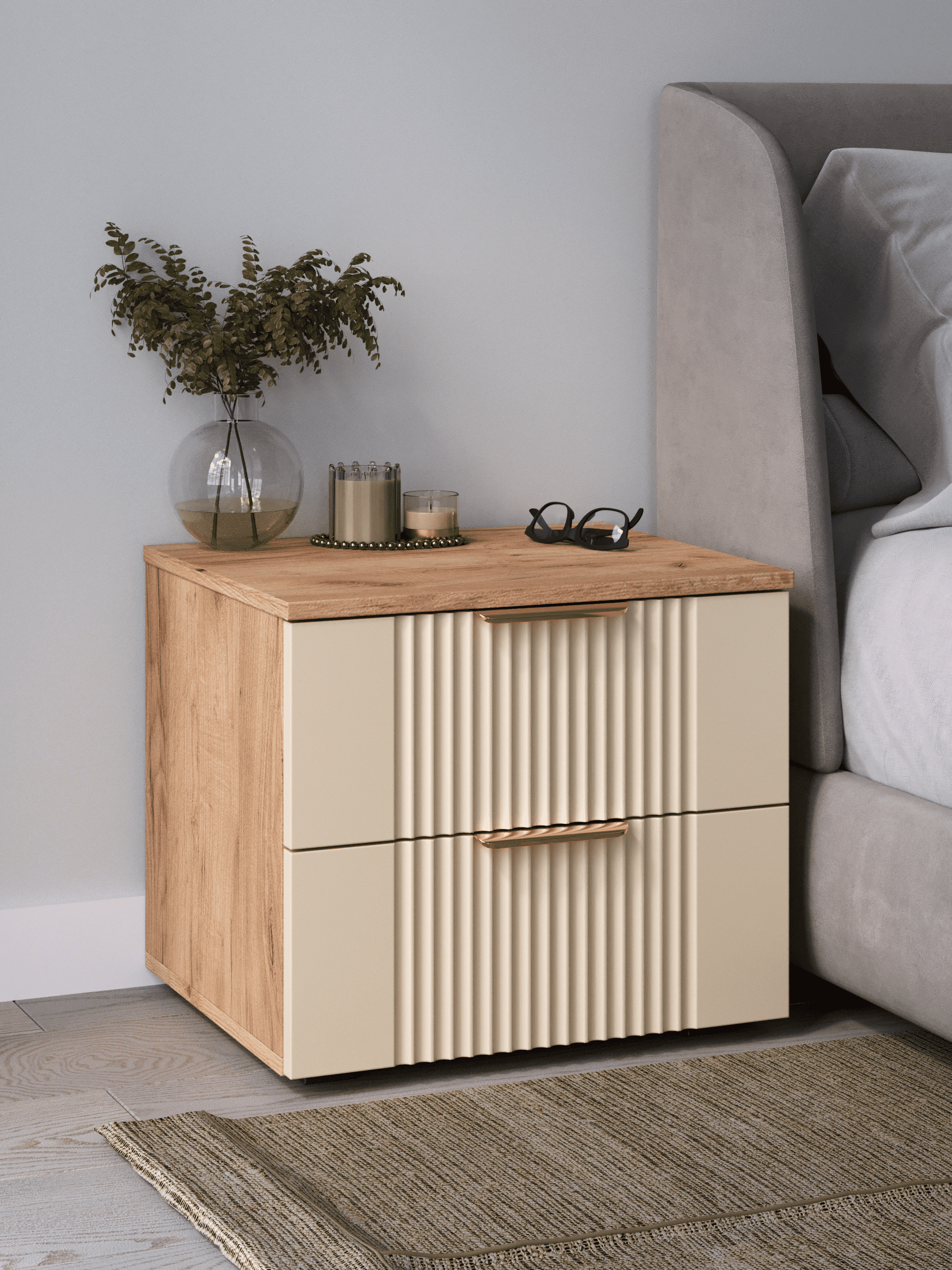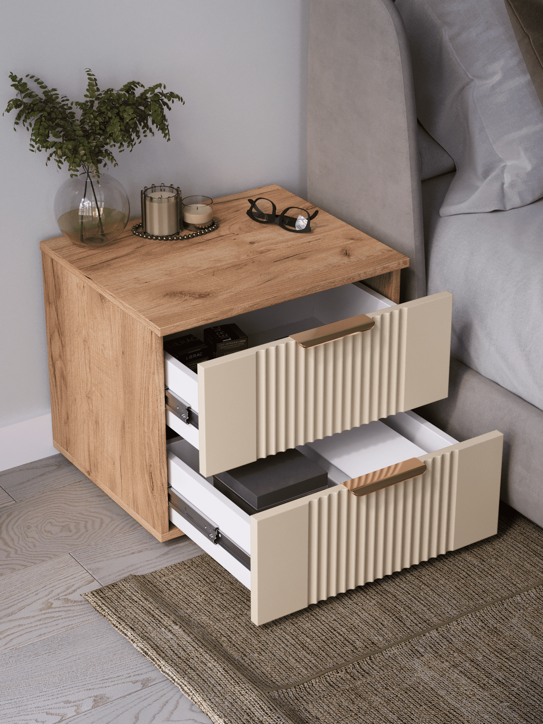Прикроватная тумба с ящиками, соединяет в себе комфорт, функциональность и эстетику. Наша прикроватная тумба напольная Ингрия Luxe 2 российского производства выглядят легко и современно, идеально впишется в лофт, скандинавский, современный, минимализм и прочие популярные стили интерьеров. Ее минималистичный дизайн придадут легкость и простор всему вашему интерьеру. Тумба напольная размером 50х44х42 (ШхВхГ) см, компактная тумба сэкономит пространство и организует грамотное хранение вещей. Тумба с двумя выдвижными ящиками изготовлен из материалов высокого качества. За высокопрочность и долговечность отвечает корпус, выполненный из ЛДСП, подходит для активного использования. За эстетику и лаконичность дизайна отвечает фасад из МДФ созданный путем сложной фрезеровки в виде стильного 3D рисунка. Накладная алюминиевая ручка 128 мм подчеркивает монолитный образ. За удобство и комфорт открывания отвечают шариковые направляющие (без доводчиков), с полным выдвижением. Ящики с такой системой открывания будут ходить практически бесшумно, и выдвигаться полностью, даже при повышенной нагрузке. Высокий мебельный модуль имеет регулируемые ножки, что позволит выставить узкий шкаф на устойчивую и нужную вам высоту. Небольшая тумба-столик поставляется в разобранном виде, пусть это вас не пугает. В комплекте предусмотрены все необходимые комплектующие, подробная инструкция и фурнитура, чтобы тумба прикроватная не отняла много времени на сборку. Современная мебель должна не только брать на себя пару задач по организации пространства, но и гармонично смотреться, выполняя нужные нам функции. Поэтому нашу тумбу можно использовать в разных помещениях в гостиной, спальне, прихожей (коридоре), в детской, в офисе, в салоне красоты, на балконе. Тумбочка Ингрия справится со всеми возложенными на нее функциями. Эта узкая тумба является очень вместительной, по этому вы можете использовать её как панель под телевизор, как модуль мебельный под одежду, ниша для вещей, полка под аквариум, тумба в прихожую, шкафчик под принтер, как прикроватная подставка, например, для телефона, стакана с водой, будильника и прочих мелочей, которые могут понадобиться среди ночи. Перед отправкой мебели, наши комоды и тумбы проходят проверку на наличие брака. Для целостности и сохранности каждого изделия мы разработали усиленную, надежную упаковку. Европейское качество от российского производителя - по доступным ценам.