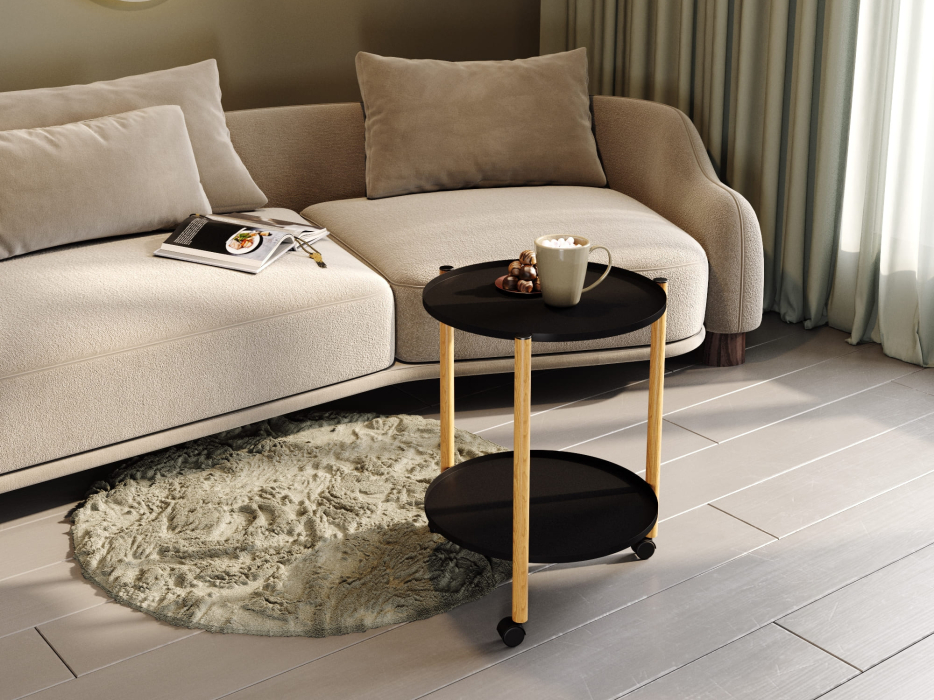 Оснащен 2-мя подносами, на которых можно разместить журналы, фрукты с напитками, декоративные элементы, а также быстро собрать и отвезти грязную посуду на кухню после приема гостей.