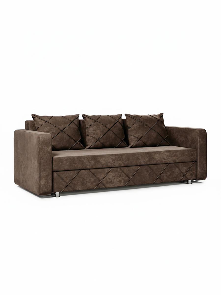 Диван-кровать «Стелла » – превосходная модель мягкой мебели, которая легко станет дизайнерской «изюминкой» гостиной, спальни или дачи. Эта привлекательная модель изготовлена из ДСП, высококачественной фанеры и бруса хвойных пород по лучшим технологиям изготовления мебели. Также диван-кровать «Стелла» дополнен ящиком для белья. Каркас: массив дерева(сосна), ДСП, фанера. Механизм: еврокнижка Ткань: Плюш Спальное место (ШхДмм): 1450х1900 Наполнитель: ППУ(износостойкий, долговечный поролон) Все подушки в комплекте.Срок гарантии на изделие: 18 месяцев.