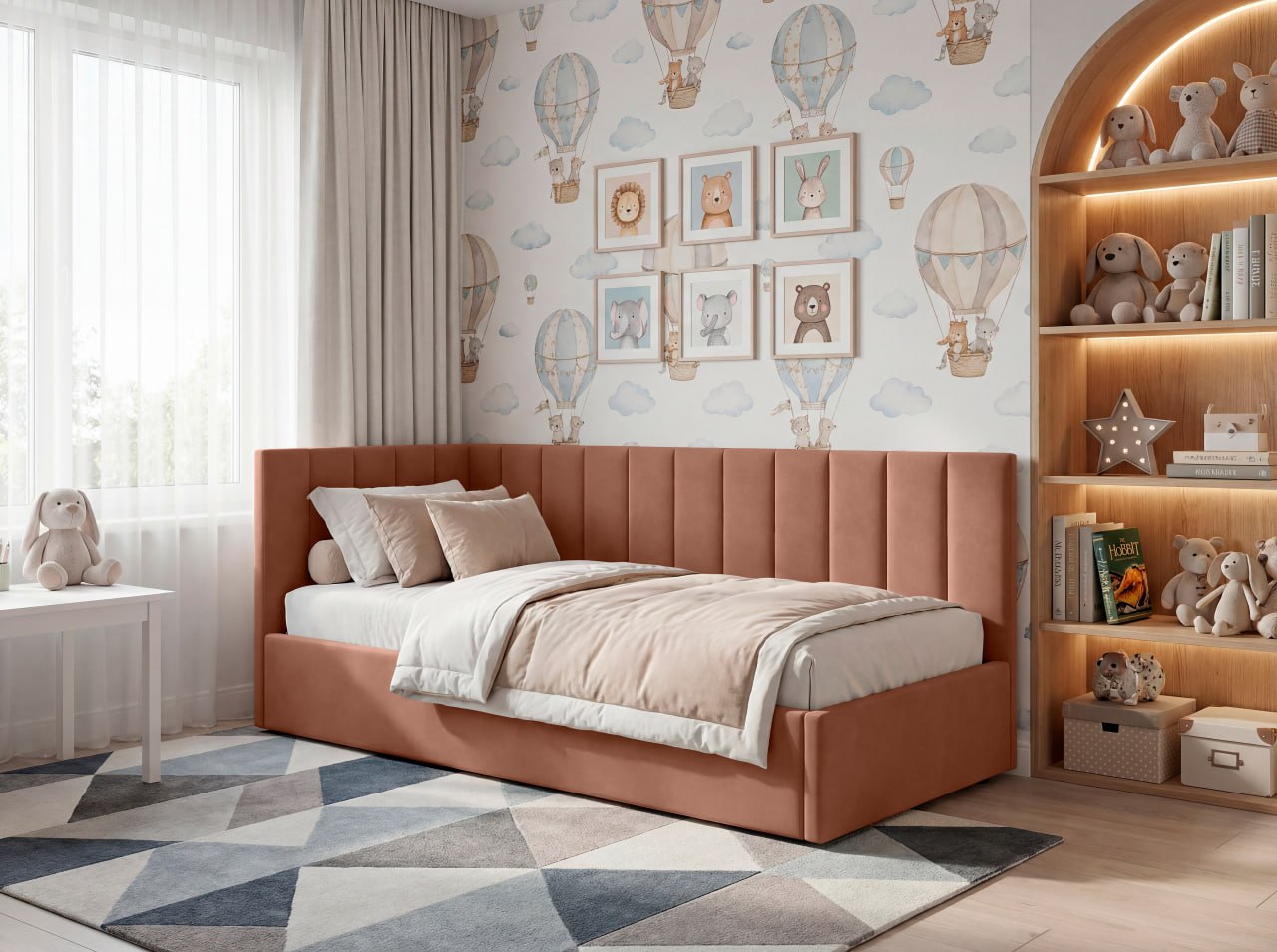 KID — больше, чем односпальная кровать. Это уют, который нравится детям, и, практичность, которую ценят родители. Мягкие линии, современная эстетика и комфортная спинка делают её идеальной для сна, отдыха и чтения. Она создана для ежедневного использования. Кровать не перегружает пространство и визуально сохраняет лёгкость в комнате. Комфортная спинка — удобно опираться во время чтения или отдыха. Размер: 2140*1050*920см (д*в*ш), спальное место (размер матраса): 90×200 см — оптимальный формат для ребёнка и подростка, который растёт, а, также, для отдыха взрослого человека, для гостевой комнаты. Подъёмный механизм: есть. Прочная сварная ортопедическая решетка. Бельевой ящик: есть. Опоры: пластик. Каркас: брус/фанера/ДСП. Наполнение каркаса и спинок: ППУ. Ткань - велюр с трендовой цветовой палитрой. Угол универсальный (право/лево). Задняя стенка изголовья выполнена из технической ткани. Качество материалов: в конструкции используются качественные материалы и надёжные элементы, рассчитанные на активную ежедневную эксплуатацию, чтобы кровать сохраняла форму и комфорт в течение долгого времени. Матрас приобретается отдельно, с необходимыми свойствами (пружинный, безпружинный, с нужным уровнем допустимой нагрузки, жесткостью, наличием нужных слоев), рекомендуемая высота - 21-23 см. Комплектация: 3 пакета. Вес - 69 кг.