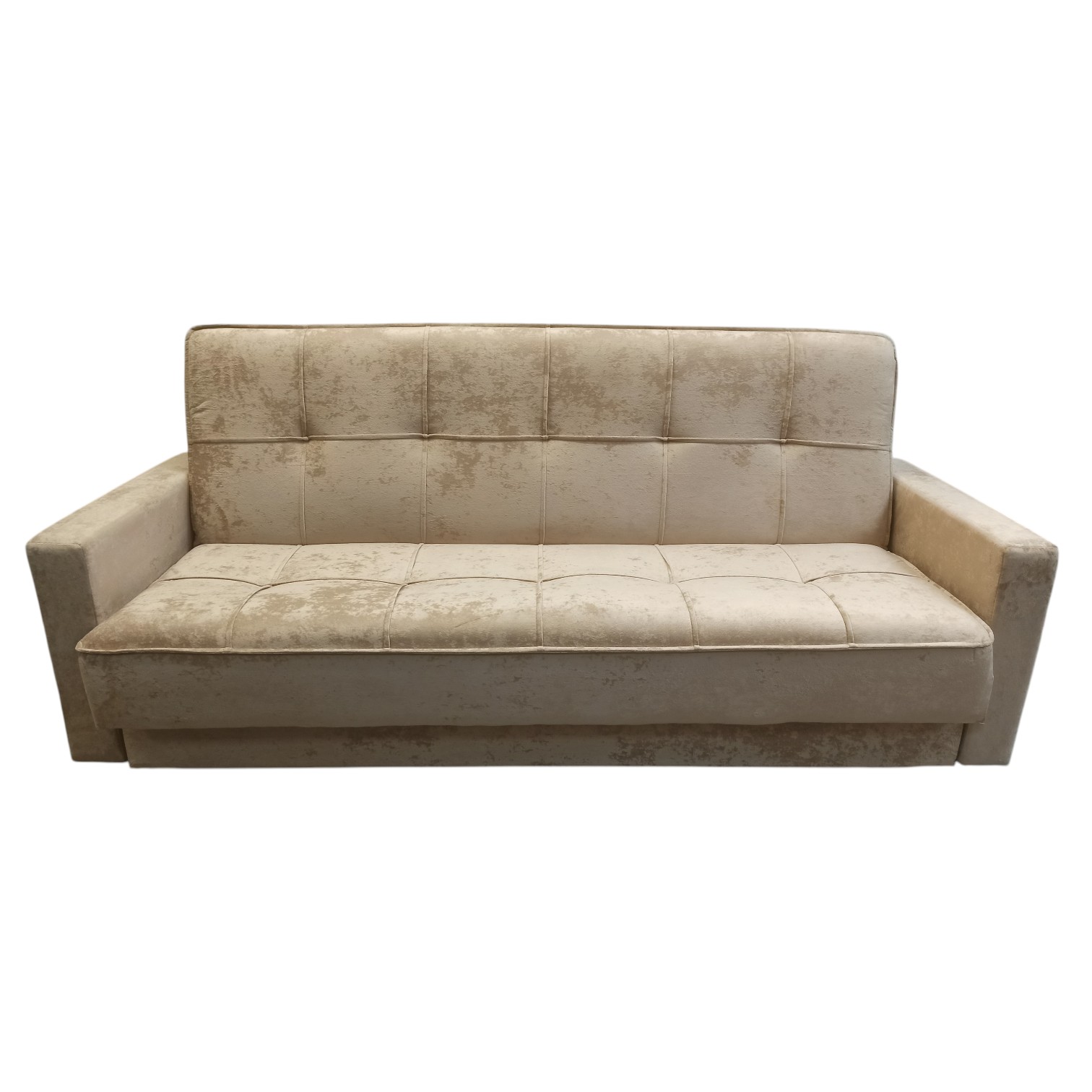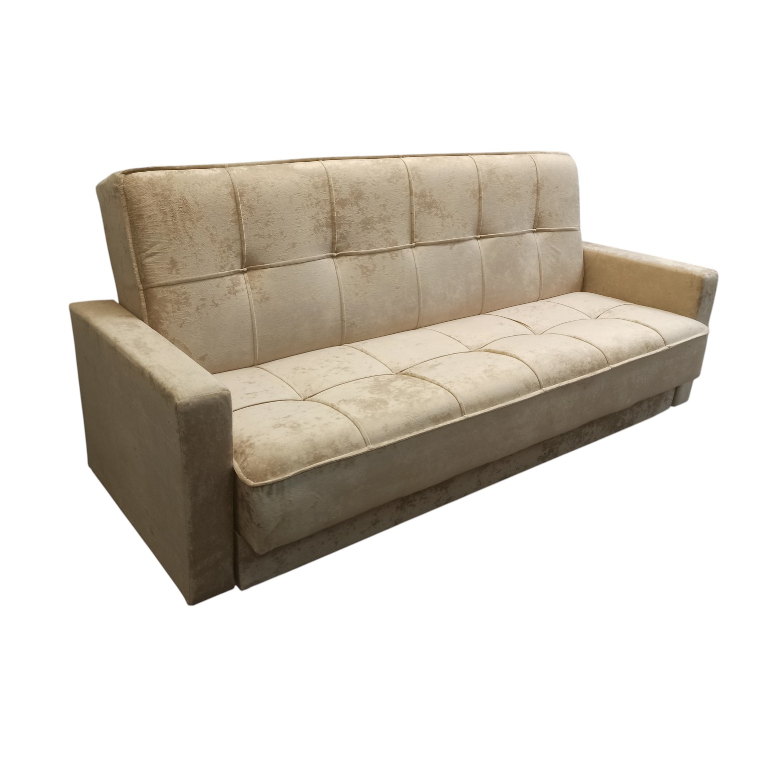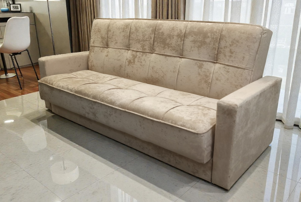 Диван-книжка изготовлен из ткани велюр. ВЕЛЮР - на вид напоминает бархат, приятен на ощупь – мягкий и пушистый. Ткань отличается прочностью и не выгорает на солнце. Материал представляет собой нетканое полотно, на которое методом напыления наносится бархатистая поверхность. Используются и пропитки – с их помощью ткань снабжается слоями, отторгающими влагу и грязь. Подходит для помещений с домашними животными. Диван имеет трансформацию раскладывания "Книжка". В положение спального места диван преобразуется путем откидывания спинки дивана назад. Сложить диван тоже не представит труда. Для этого нужно поднять переднюю часть сидения и наклонить ее вперед до щелчка пружины в механизме. Когда пружинный механизм сработает, части дивана зафиксируются в положении угла. После этого наклоняйте поднятое ранее сидение на себя.