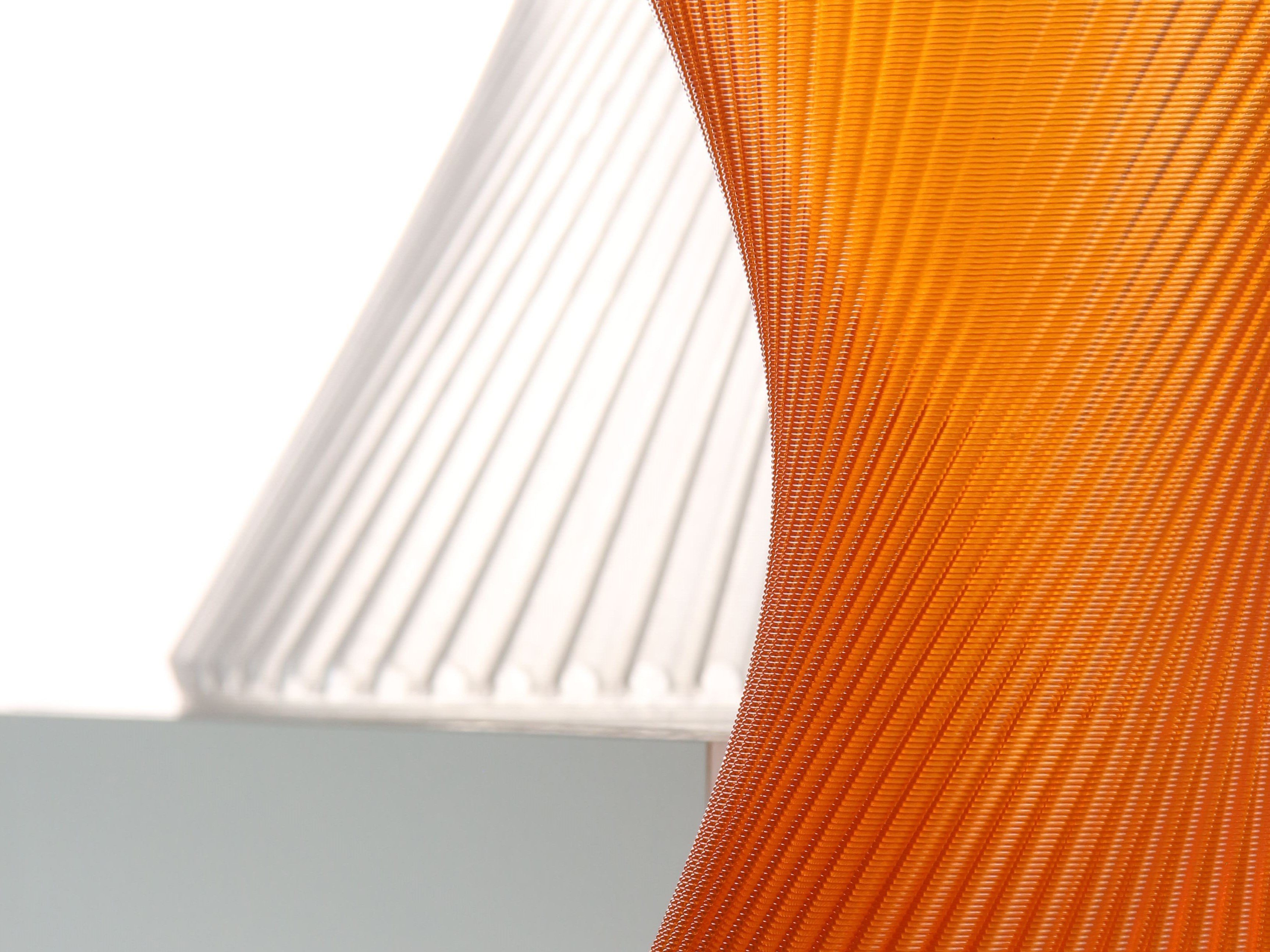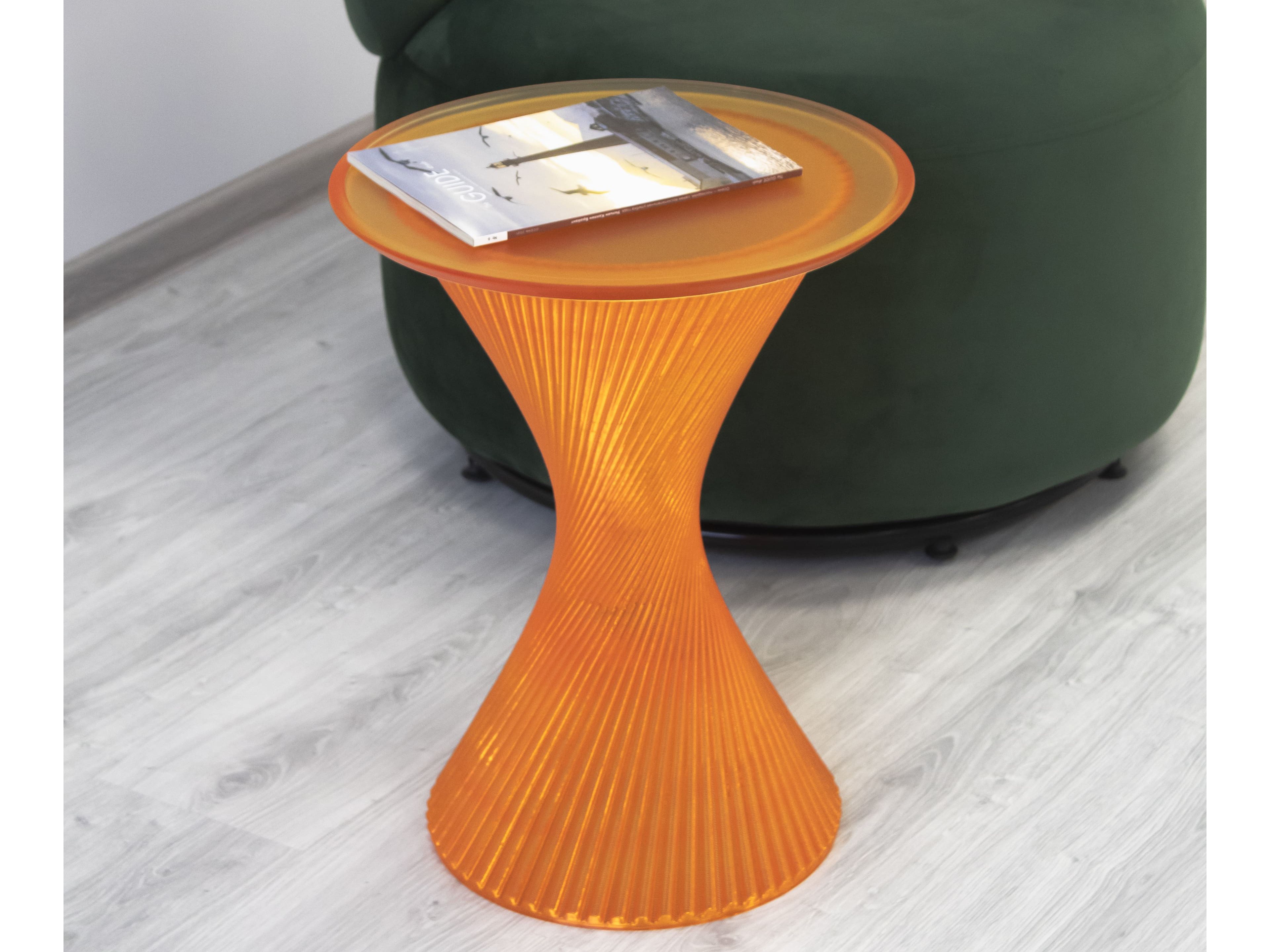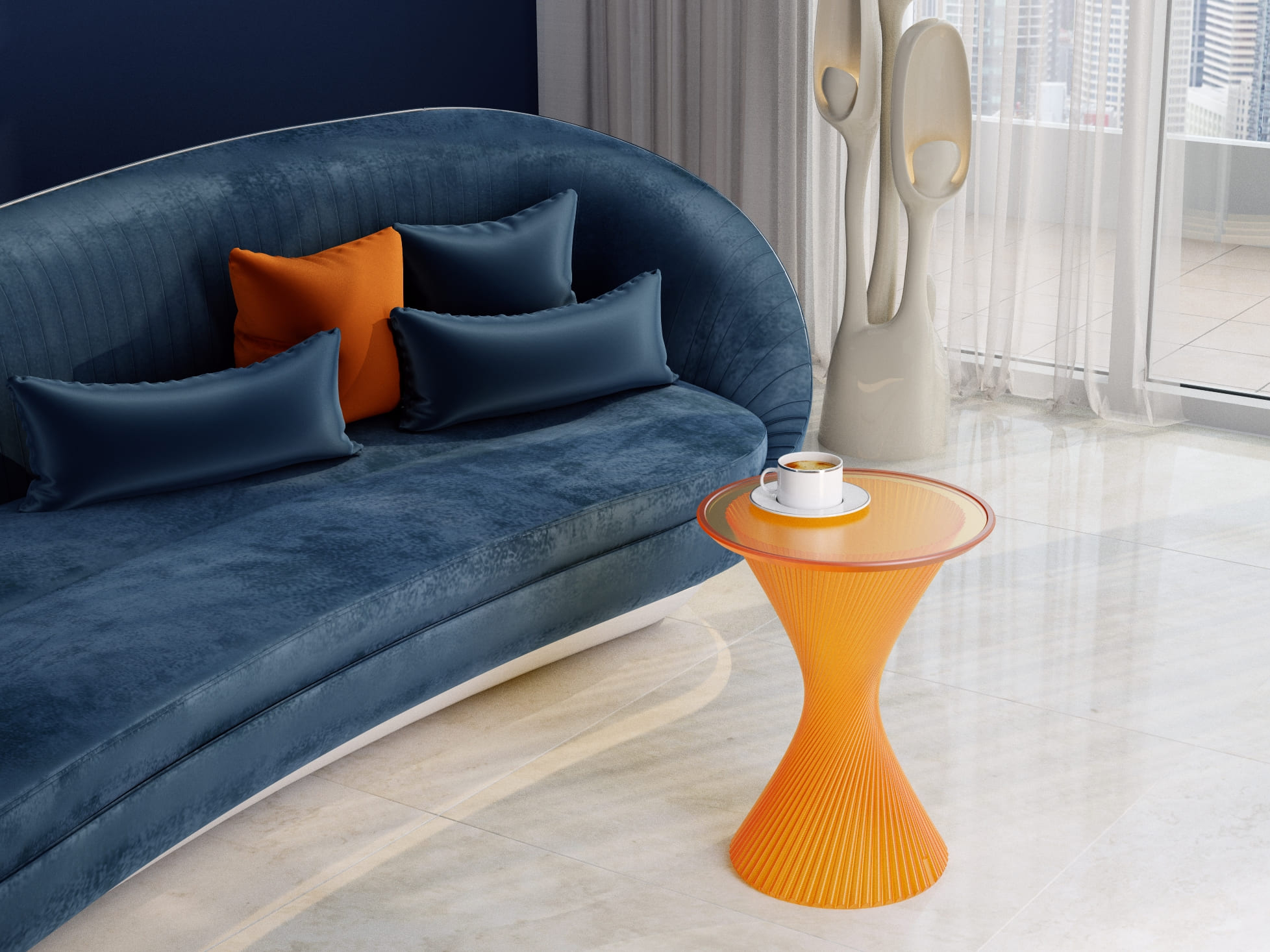 Благодаря использованию стекловидного материала, лучи проходящего света создают необыкновенную игру бликов, и делают столик визуально лёгким, не перегружая пространство.