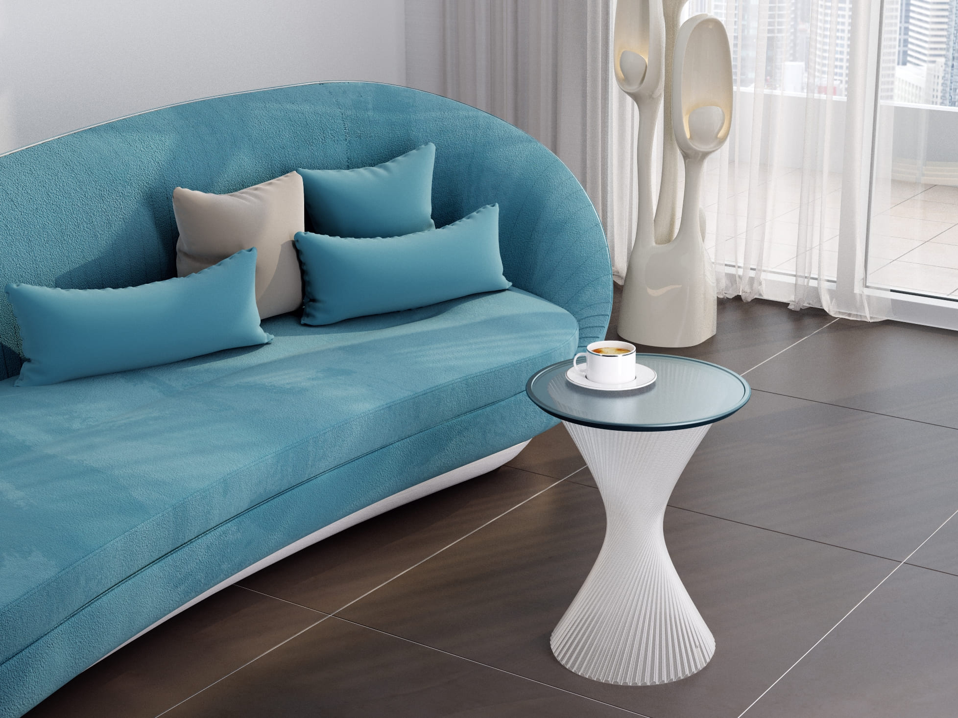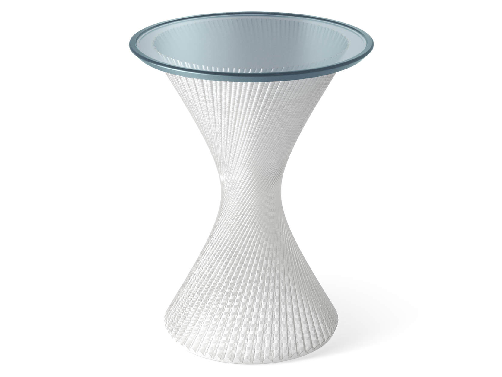 Благодаря использованию стекловидного материала, лучи проходящего света создают необыкновенную игру бликов, и делают столик визуально лёгким, не перегружая пространство.