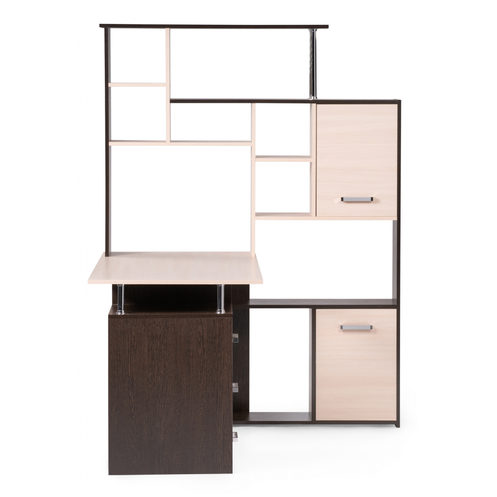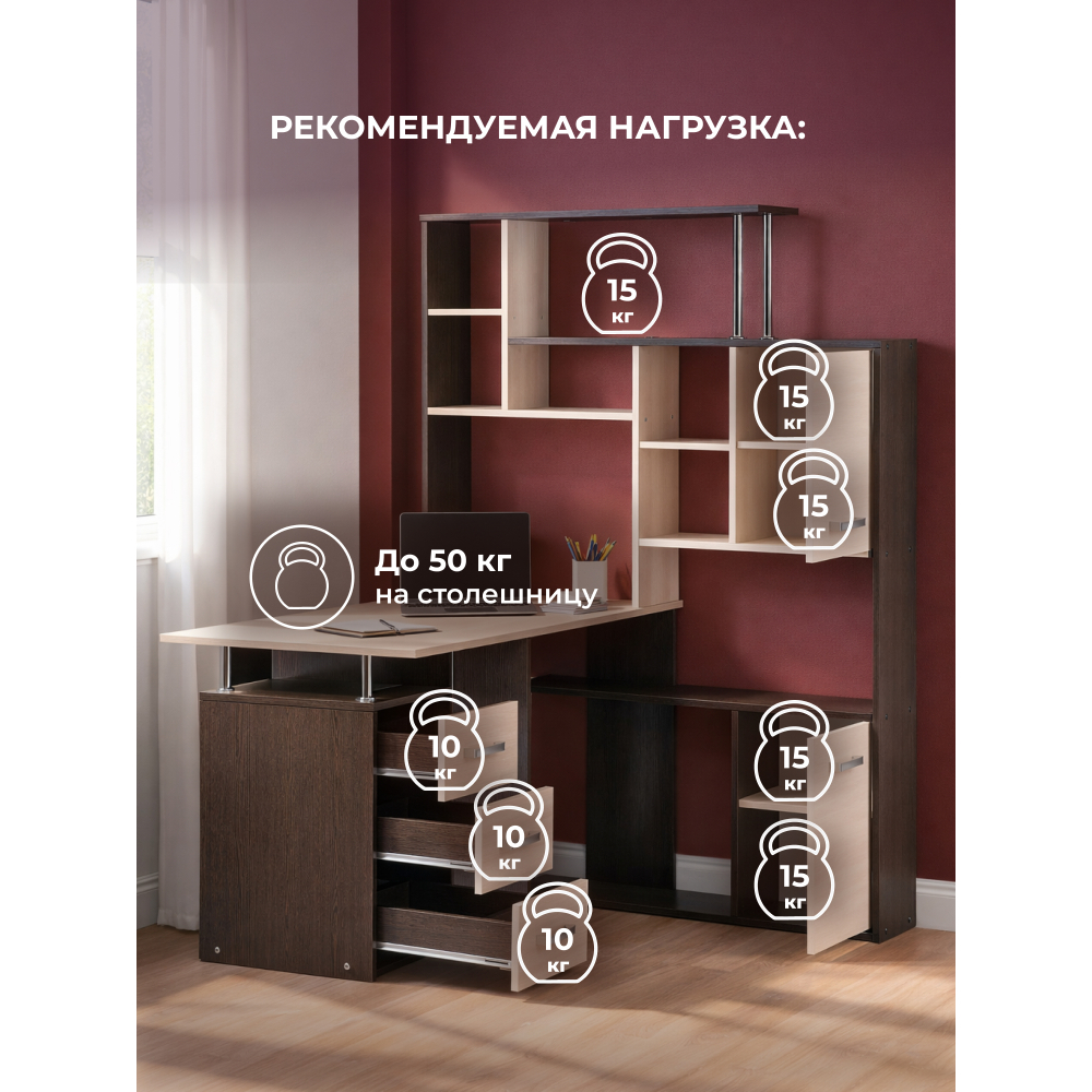 Стол КС-15 венге / дуб молочный правый; ЛДСП. Высота столешницы 75см. Рабочее место - 142х62см. Толщина ЛДСП - 16мм. Имеется 3 выкатных ящика на роликовых направляющих, 4 закрытых дверьми полки. Огромная вместительность для учёбы