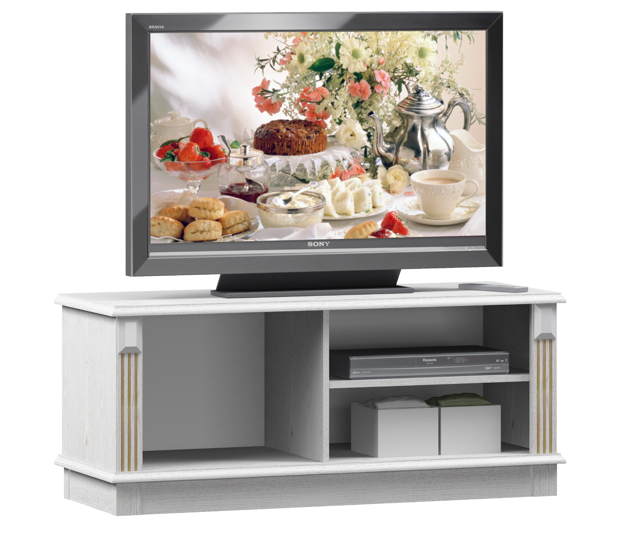 Габаритные размеры – ширина 120 см, высота 53 см и глубина 44 см. Вес тумбы 36,85 кг, что даёт возможность передвигать её по усмотрению. Под столешницей расположены две открытых полки и отделение с отдельной дверцей. Тумба выполнена в классическом дизайне из прочного современного КДСП в цвете «Белый Ясень», рамочный фасад выполнен из МДФ.