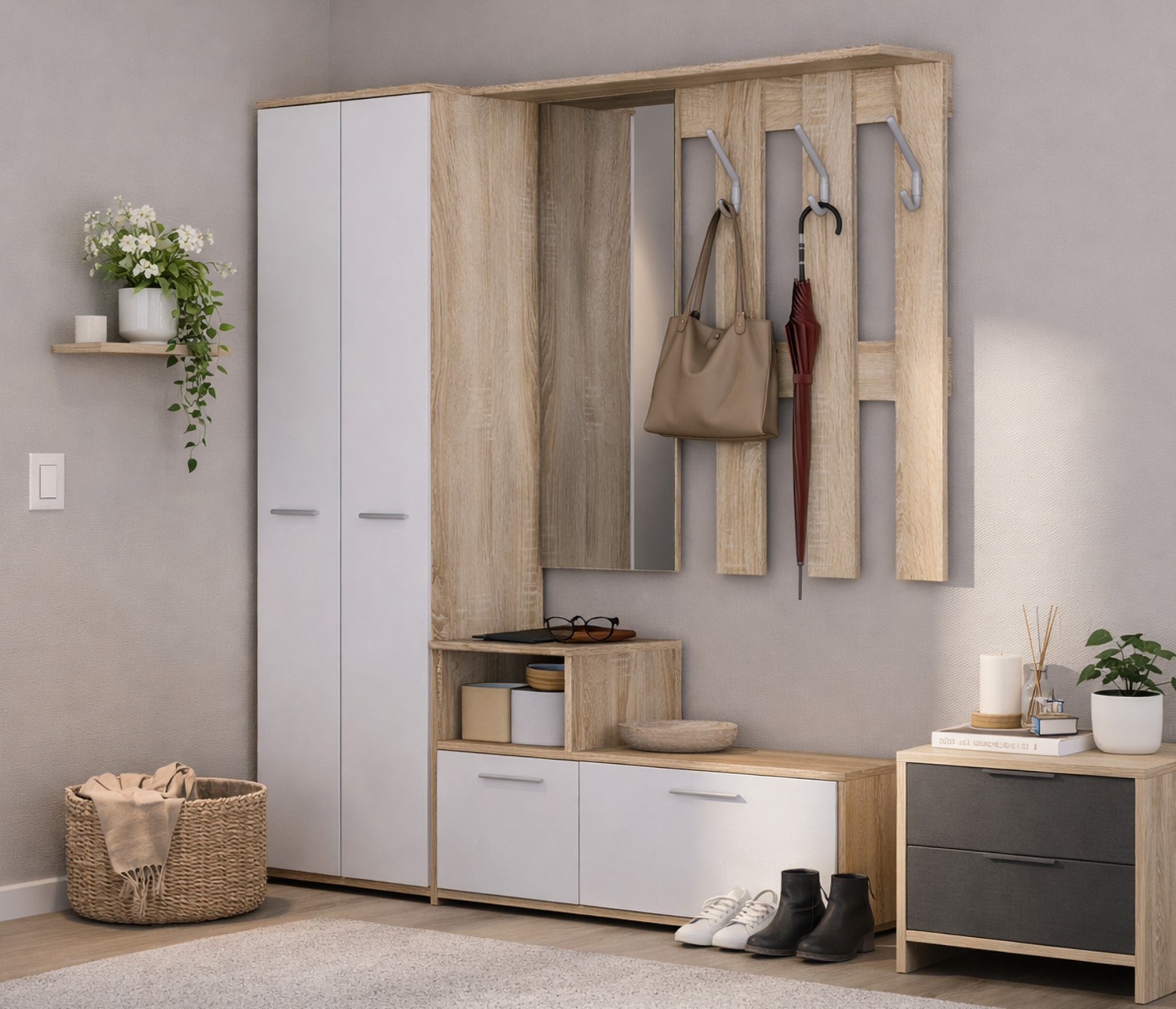 Выполнен шкаф из современного и качественного материала КДСП. Внешняя отделка комбинированная – корпус в цвете «Дуб Сонома», фасады чисто белые.