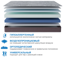 Один из лучших матрасов в нашем ассортименте беспружинных матрасов. Основу матраса составляют 3 вида премиальной пены. Верхний слой - пена с памятью формы, которая создает воздушность и комфорт, точно повторяя и запоминая, каждый изгиб тела. Средний слой- слой пены, которая обладает исключительной упругостью, этот слой принимает на себя основную нагрузку и распределяет ее по всей поверхности, оказывая обратное давление лишь там где это необходимо. Нижний слой сделан из особо жесткой и прочной пены, которая и позволяет матрасу выдерживать очень высокие нагрузки на спальное место (до 150 кг). Чехол матраса выполнен из особо мягкого трикотажа высокой плотности, итальянского производства, ткань чехла не впитывает запахи и легко отмывается.Бурлет (бок) матраса выполнен из мебельной ткани, которая придает ему законченный вид и увеличивает срок его службы. Чехол стегается на 15 мм пене. Матрас можно заказать в скрученном в рулон виде, данный вид упаковки значительно упрощает транспортировку, ведь в рулоне он поместиться, почти в любую, легковую машину. При выборе матраса следует помнить о том, что любой матрас не отвечает за правильность положения головы и шеи, их здоровье зависит от правильно подобранной ортопедической подушки. Для увеличения срока службы матраса рекомендуется его использование с защитным чехлом AquaStop.