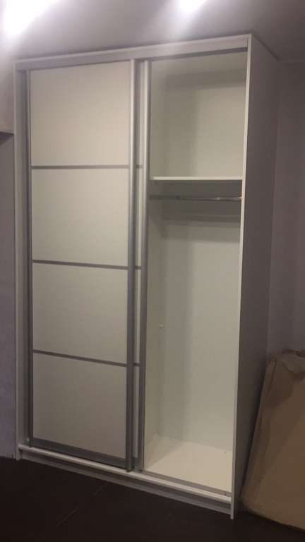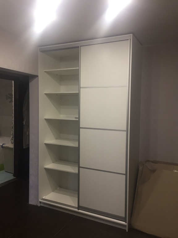 Отличный белый шкаф купейного типа. Двери легко открываются и без скрипов. Полочек много и все вместительные. Все вещи и постельное белье храним здесь.