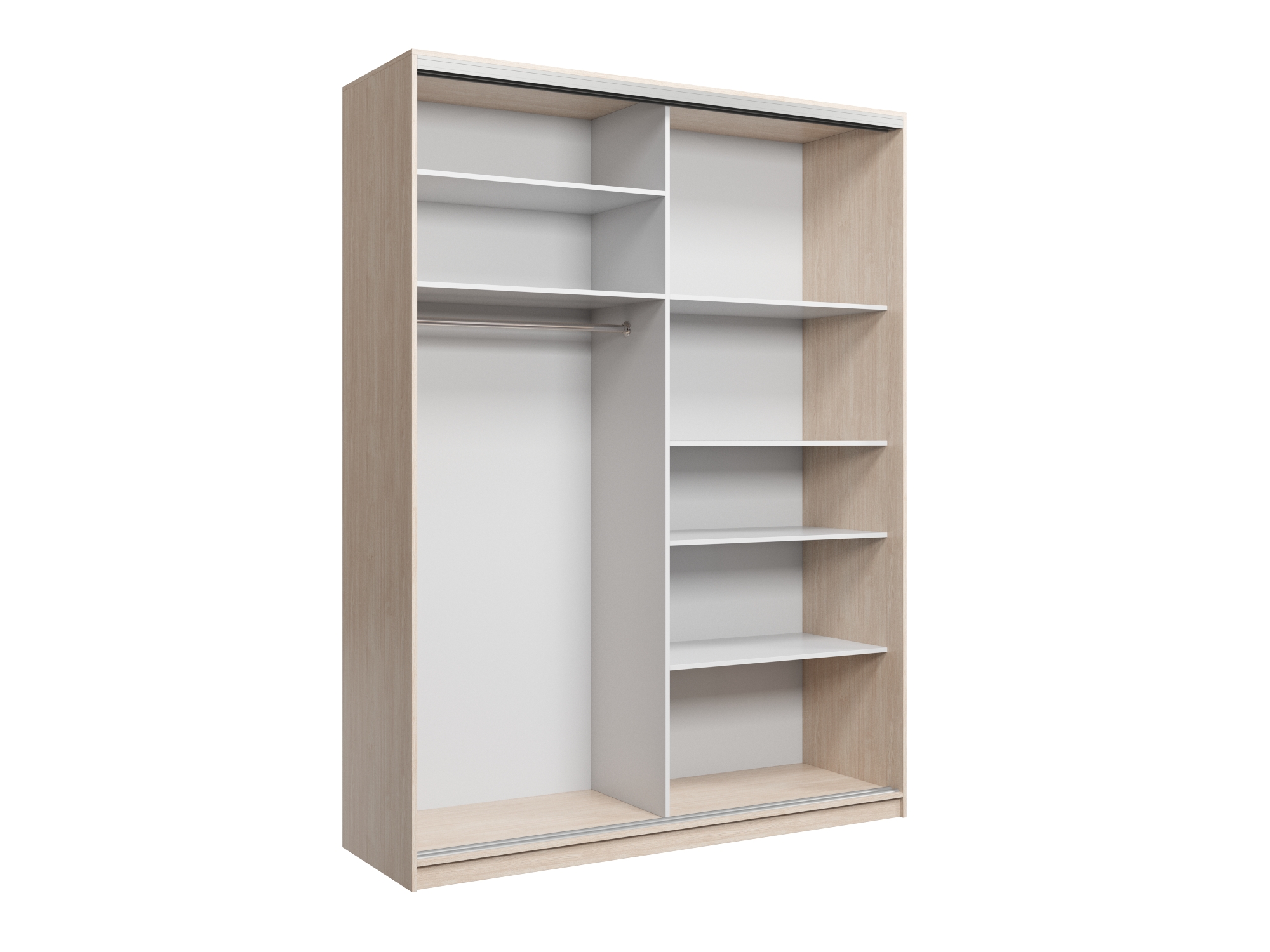 Шкаф купе Айсберг является одной из самых продаваемых моделей. Внутреннее пространство, включает в себя большое количество разных полок и отделение с штангой для вешалок. Модель выполнена из качественного ЛДСП толщиной 16 мм. а современная фурнитура, придает абсолютно тихий ход дверям.