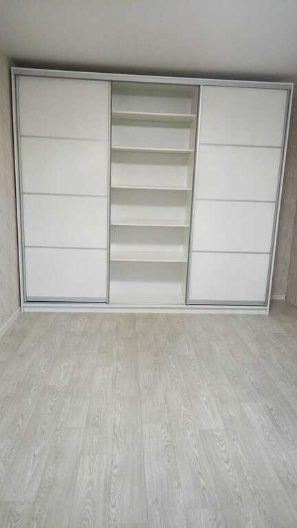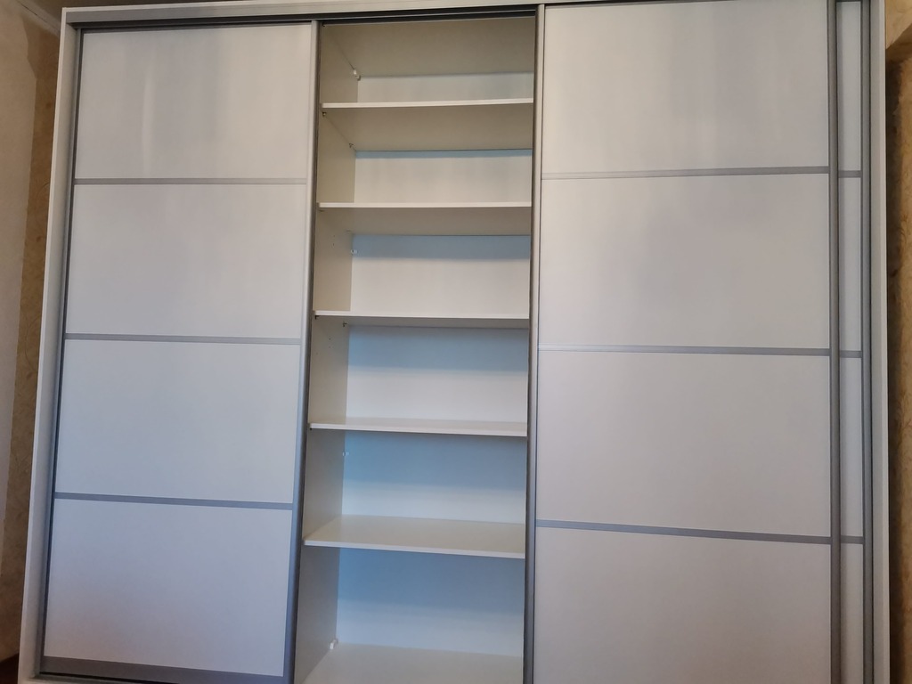 Белоснежный шкаф купе из качественного и прочного ЛДСП. Большое разнообразие полочек для хранения вещей и одежды. Доставили и собрали довольно быстро.