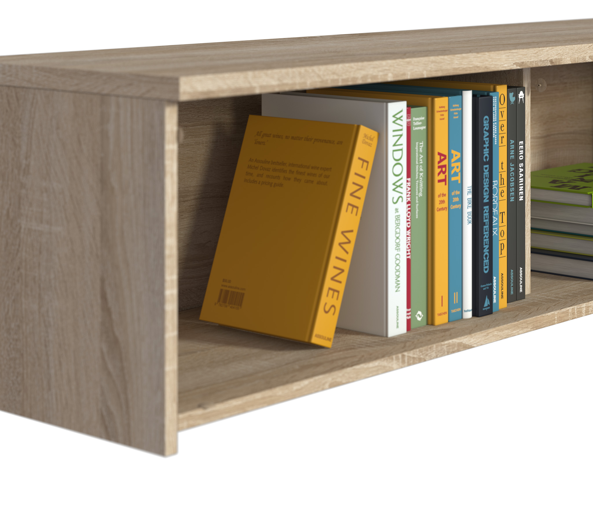 Габаритные размеры – ширина 140 см, высота 35 см и глубина 35 см. За остекленной дверцей находятся два вместительных отделения, куда можно складывать книги, посуду или сувениры.