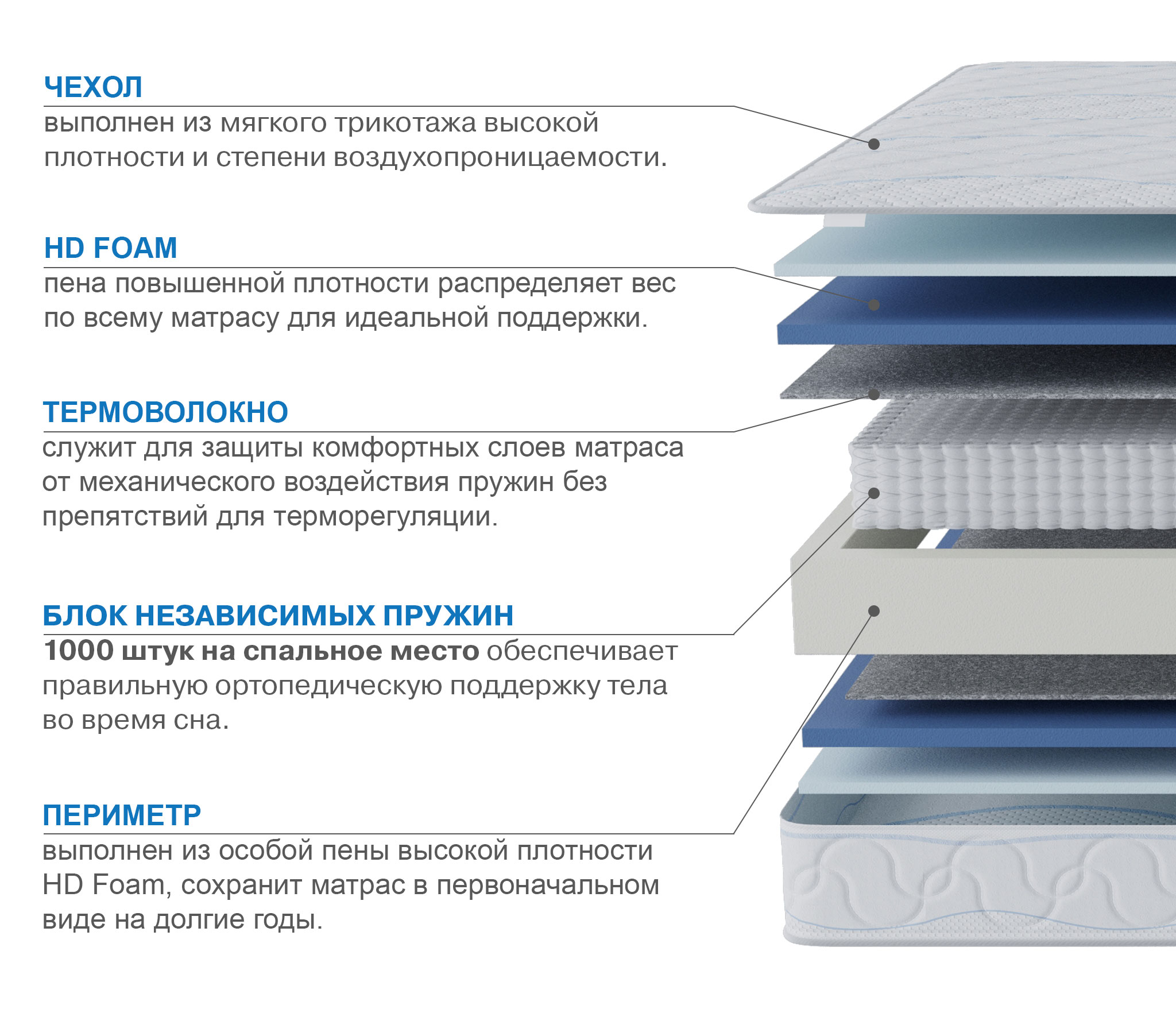 Таким образом, получилось создать матрас относительно небольшой высоты, но при этом с очень высоким уровнем комфорта.