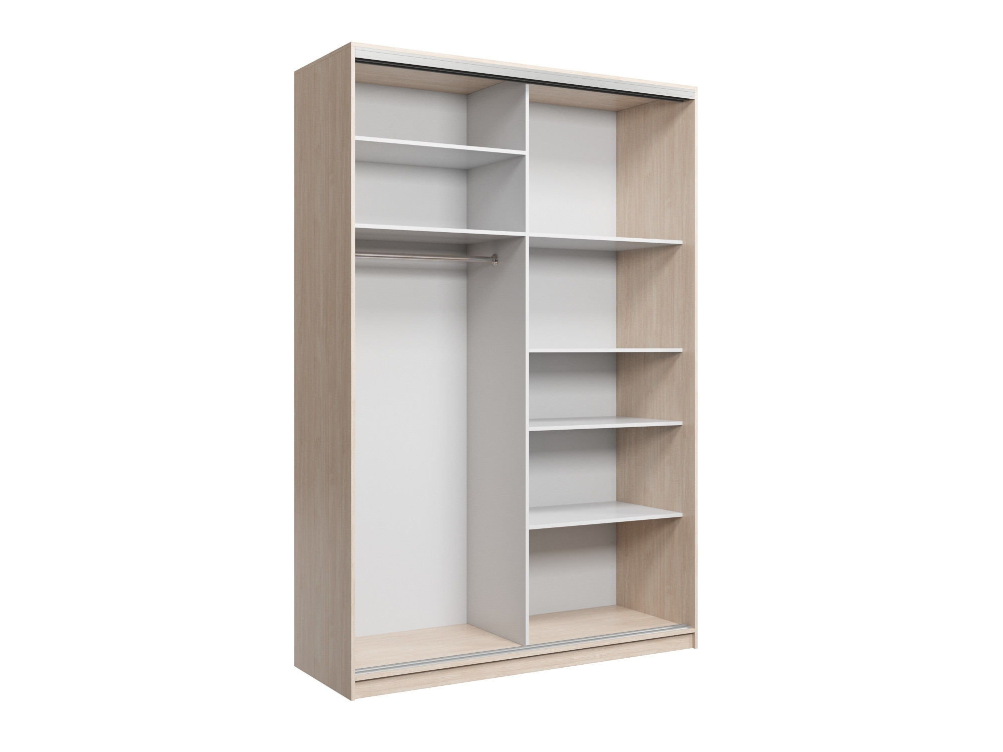 Шкаф купе Айсберг является одной из самых продаваемых моделей. Внутреннее пространство, включает в себя большое количество разных полок и отделение с штангой для вешалок. Модель выполнена из качественного ЛДСП толщиной 16 мм. а современная фурнитура, придает абсолютно тихий ход дверям.