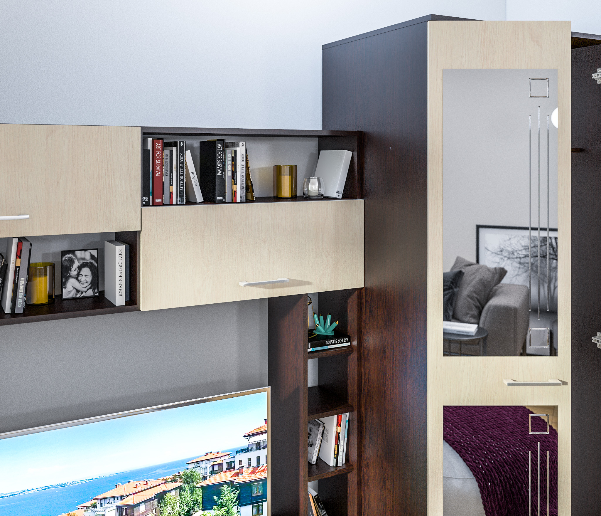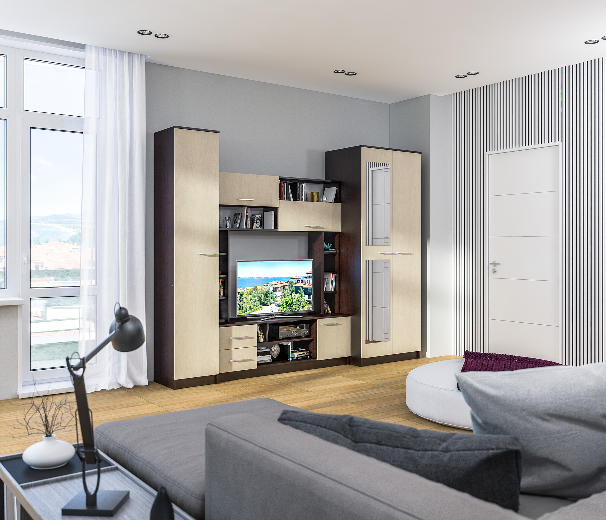 Дверь с зеркалом можно вешать на любую сторону. Шкафы так же можно менять местами.