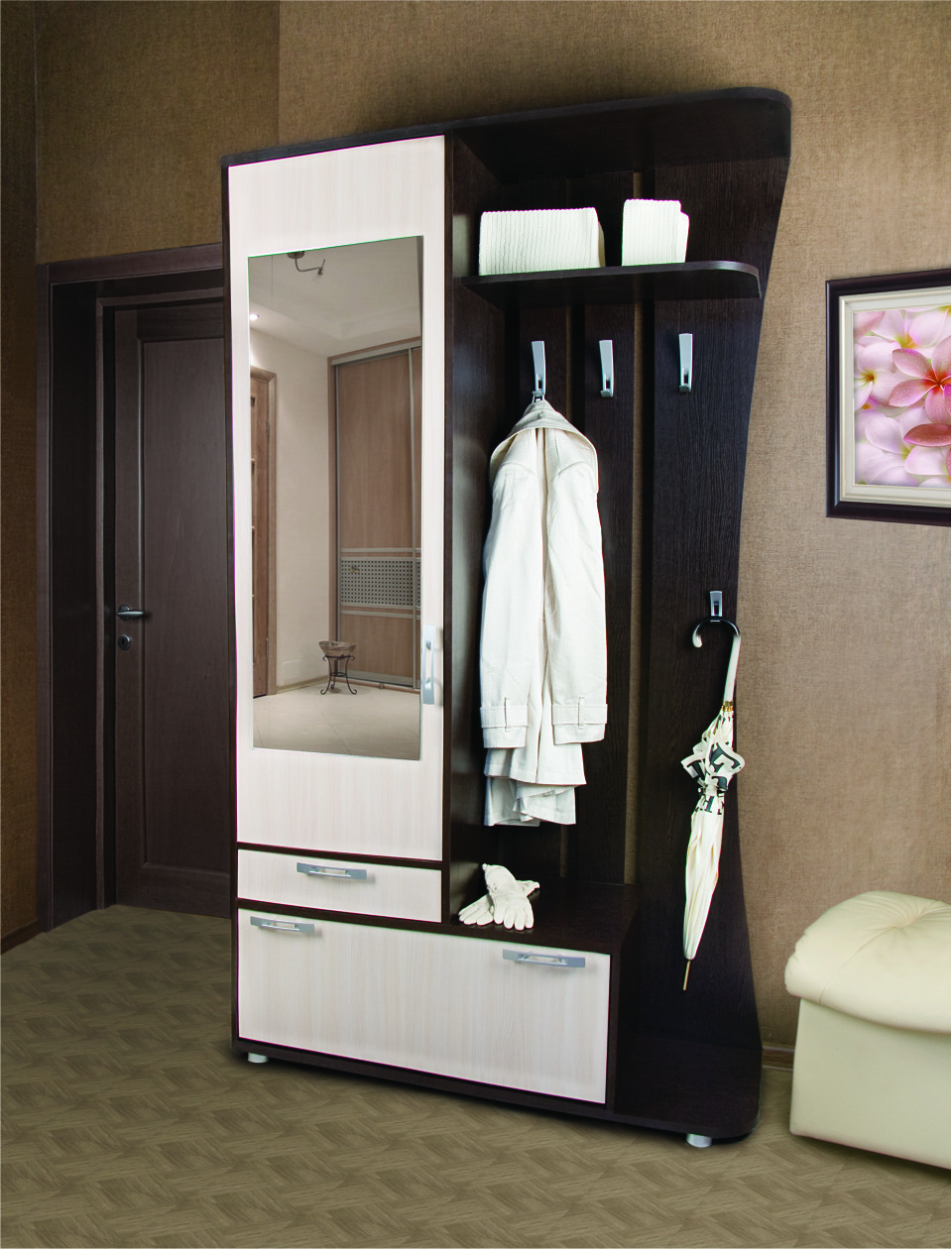 В прихожей "Классик" есть все необходимое - ящик для мелких вещей, тумба для обуви, вместительный шкаф с зеркалом, крючки для верхней одежды и полка для головных уборов, а на выступе можно даже присесть. Прихожие производятся и в левом и в правом исполнении.