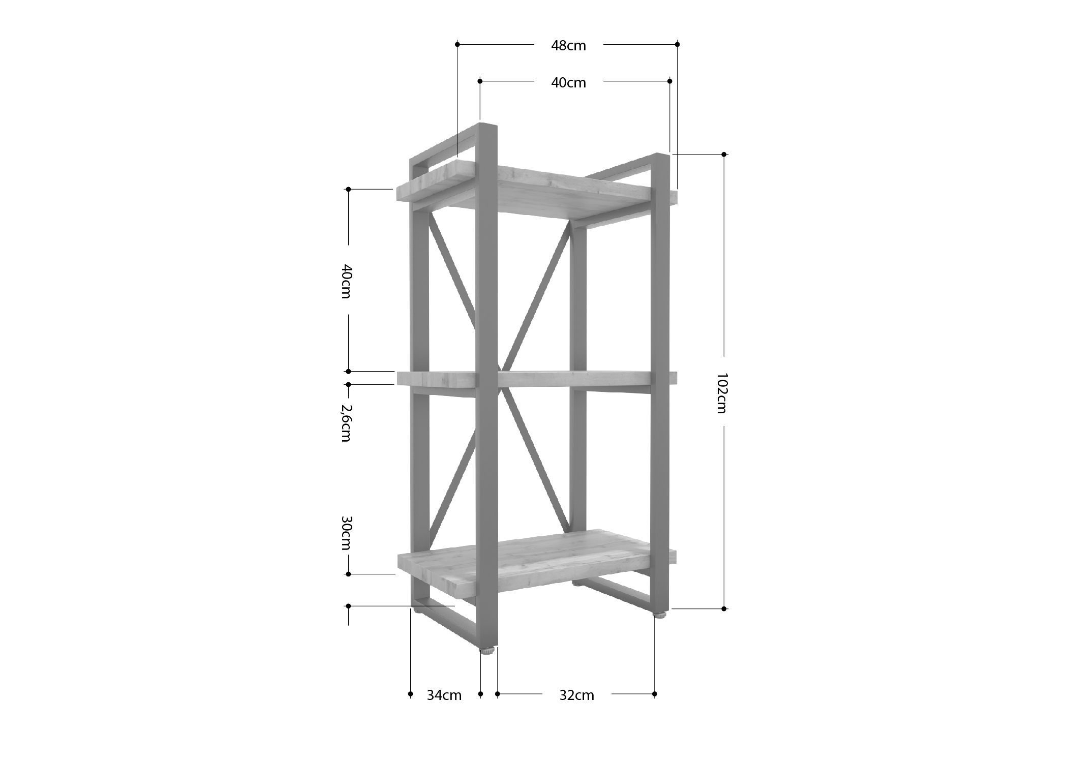 Стеллаж Айсберг в стиле лофт от Фабрики Мебели 4 Сезона. Ширина 48 см, высота 102 см, глубина 34 см. Каркас выполнен из стального профиля 40х20 мм, толщина 1,5 мм, покрыт порошковой краской. Полки ЛДСП 26 мм.