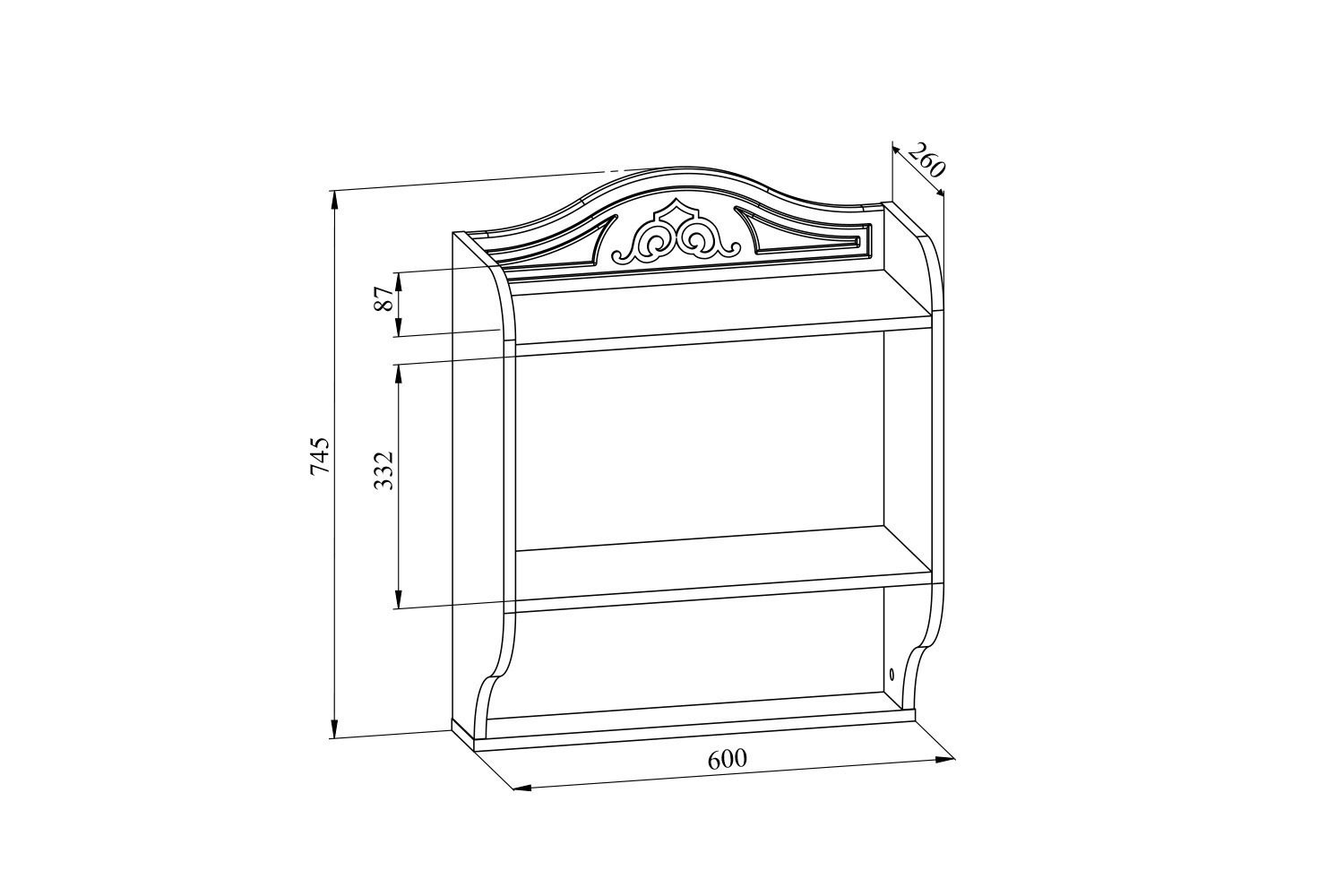 Полка из трех горизонтальных сегментов.Высота бокового борта верхнего сегмента 95 мм, среднего 340, нижнего 186 мм. Ширина верхней полки 259 мм, средней 243 мм, нижней 112 мм.