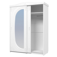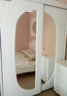 Шкаф-купе с зеркалом на фасаде. В левой части шкафа установлены три полки для сложенных вещей и два выдвижных ящика. Высота верхней полки 415мм, двух остальных — 324 мм. Высота боковых стенок каждого ящика 130 мм, ширина ящика 644 мм, глубина 500 мм. Ящики установлены на телескопических направляющих полного выдвижения. В правой части расположена штанга для одежных вешалок.