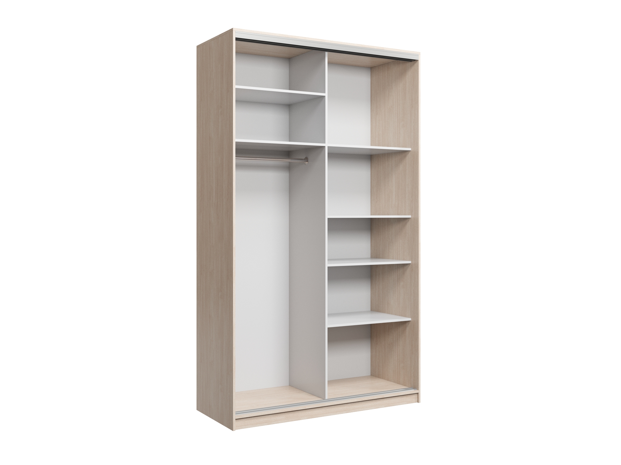 Шкаф купе Айсберг является одной из самых продаваемых моделей. Внутреннее пространство, включает в себя большое количество разных полок и отделение с штангой для вешалок. Модель выполнена из качественного ЛДСП толщиной 16 мм. а современная фурнитура, придает абсолютно тихий ход дверям.