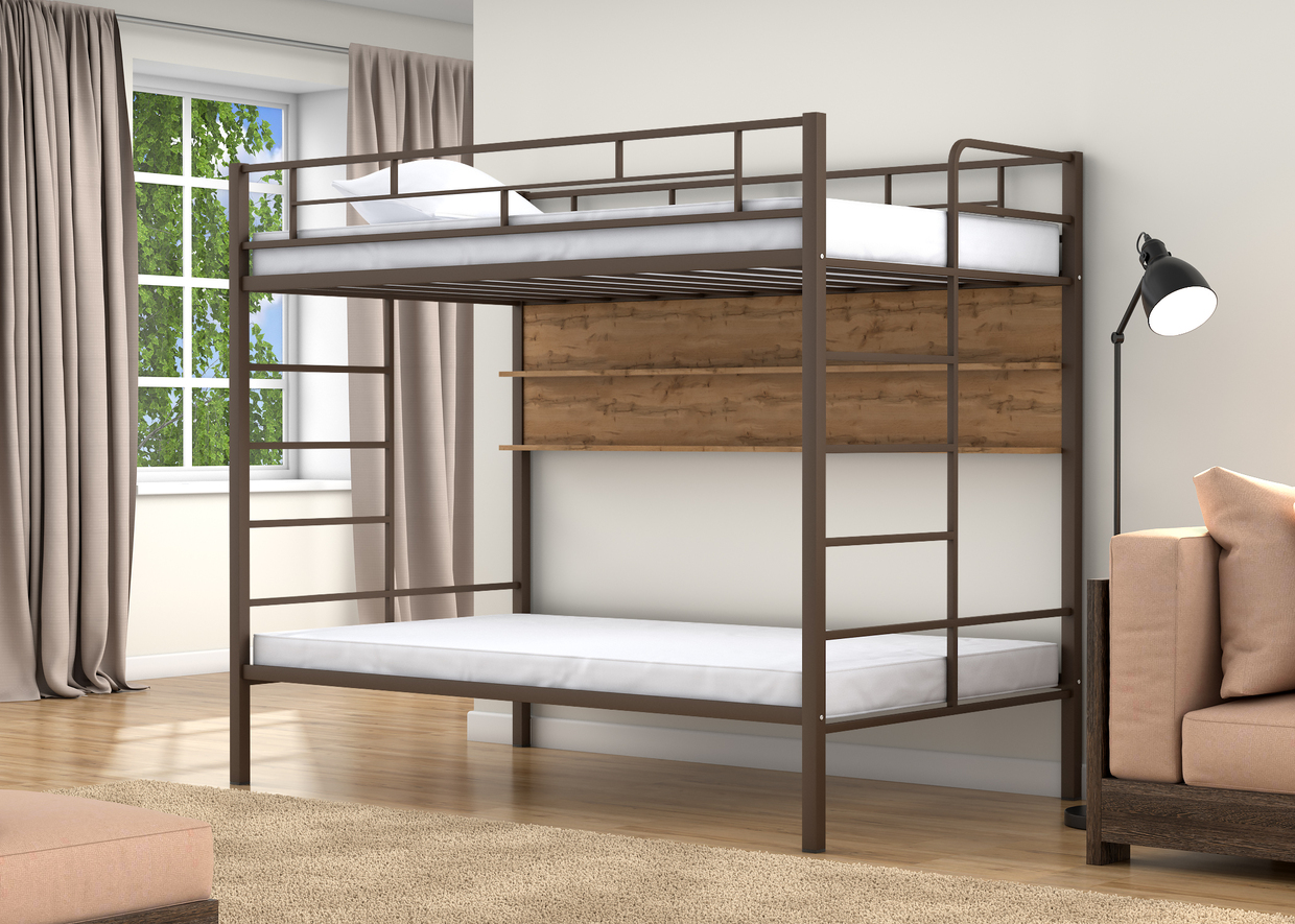 Спальные места 120х190 см., прочный стальной каркас, покрашен безопасной не имеющей запаха порошковой краской. Дополнительно комплектуется выдвижными ящиками и навесной полкой, материал ЛДСП 16 мм.