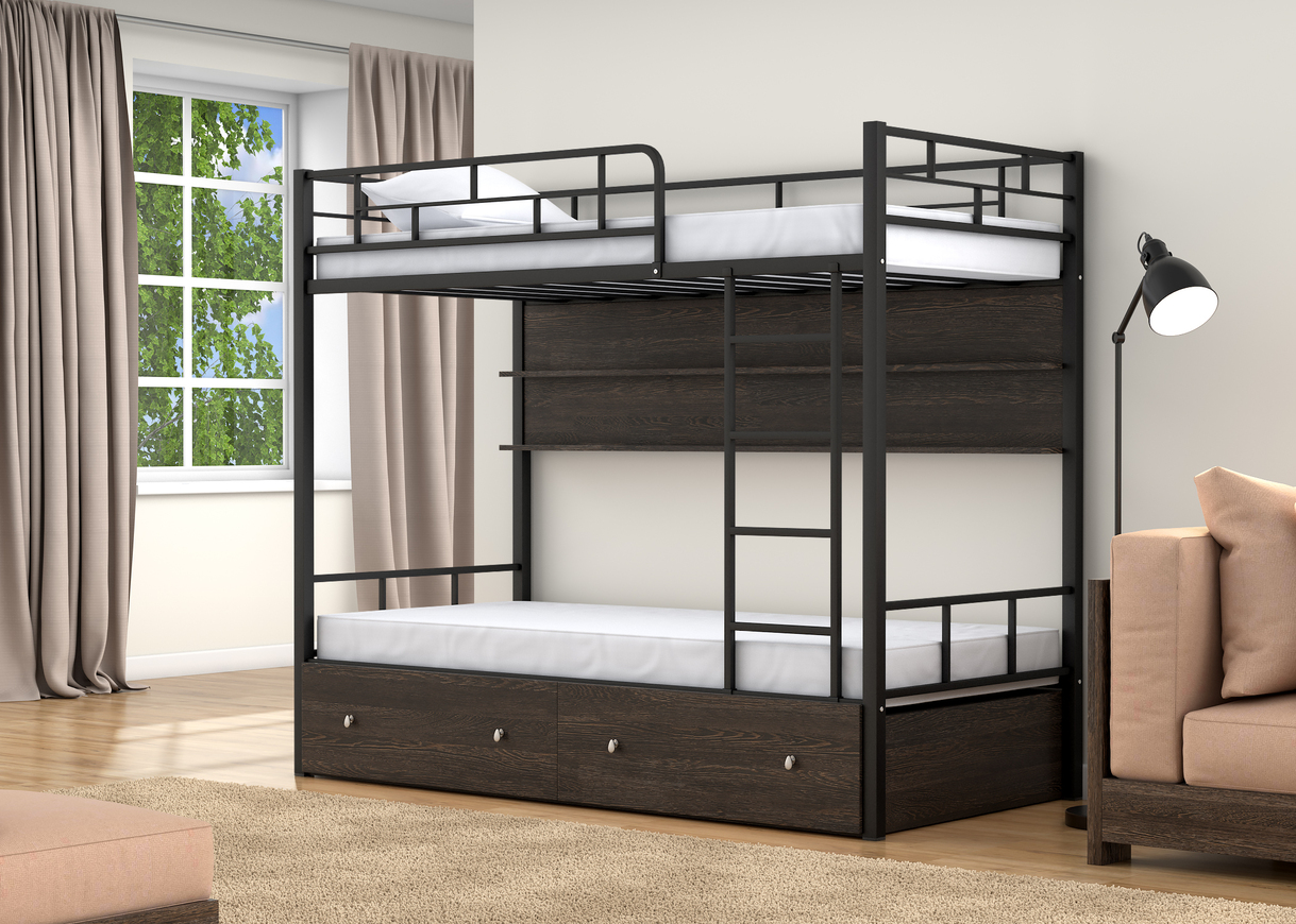 Спальные места 120х190 см., прочный стальной каркас, покрашен безопасной не имеющей запаха порошковой краской. Дополнительно комплектуется выдвижными ящиками и навесной полкой, материал ЛДСП 16 мм.