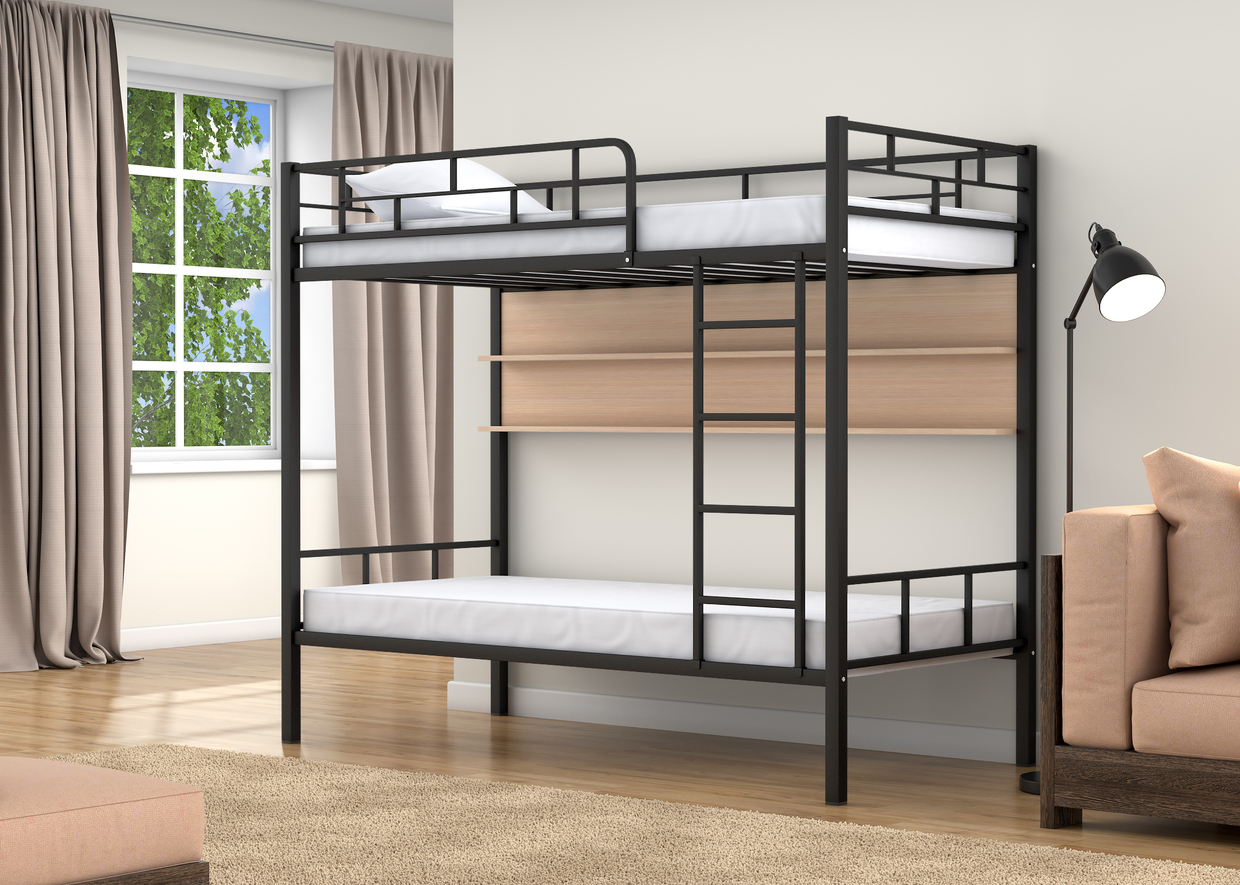 Спальные места 90х190 см., прочный стальной каркас, покрашен безопасной не имеющей запаха порошковой краской. Цвета на выбор: коричневый, черный, слоновая кость. Дополнительно комплектуется выдвижными ящиками и навесной полкой, материал ЛДСП 16 мм., цвета на выбор: дуб молочный или венге.