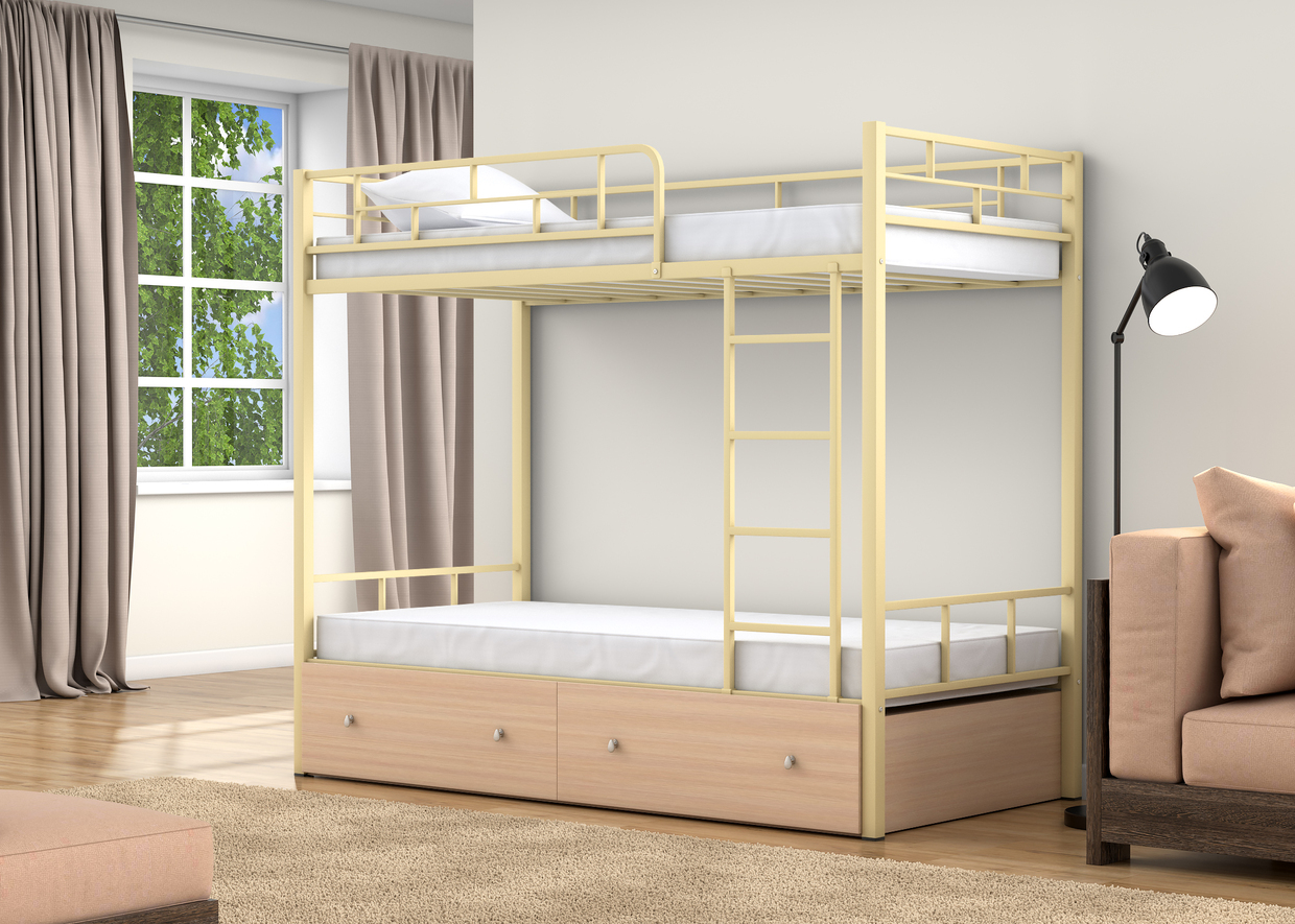 Спальные места 90х190 см., прочный стальной каркас, покрашен безопасной не имеющей запаха порошковой краской. Цвета на выбор: коричневый, черный, слоновая кость. Дополнительно комплектуется выдвижными ящиками и навесной полкой, материал ЛДСП 16 мм., цвета на выбор: дуб молочный или венге.
