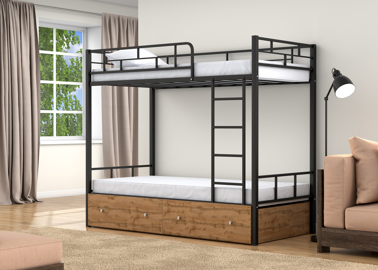 Спальные места 90х190 см., прочный стальной каркас, покрашен безопасной не имеющей запаха порошковой краской. Дополнительно комплектуется выдвижными ящиками и навесной полкой, материал ЛДСП 16 мм.
