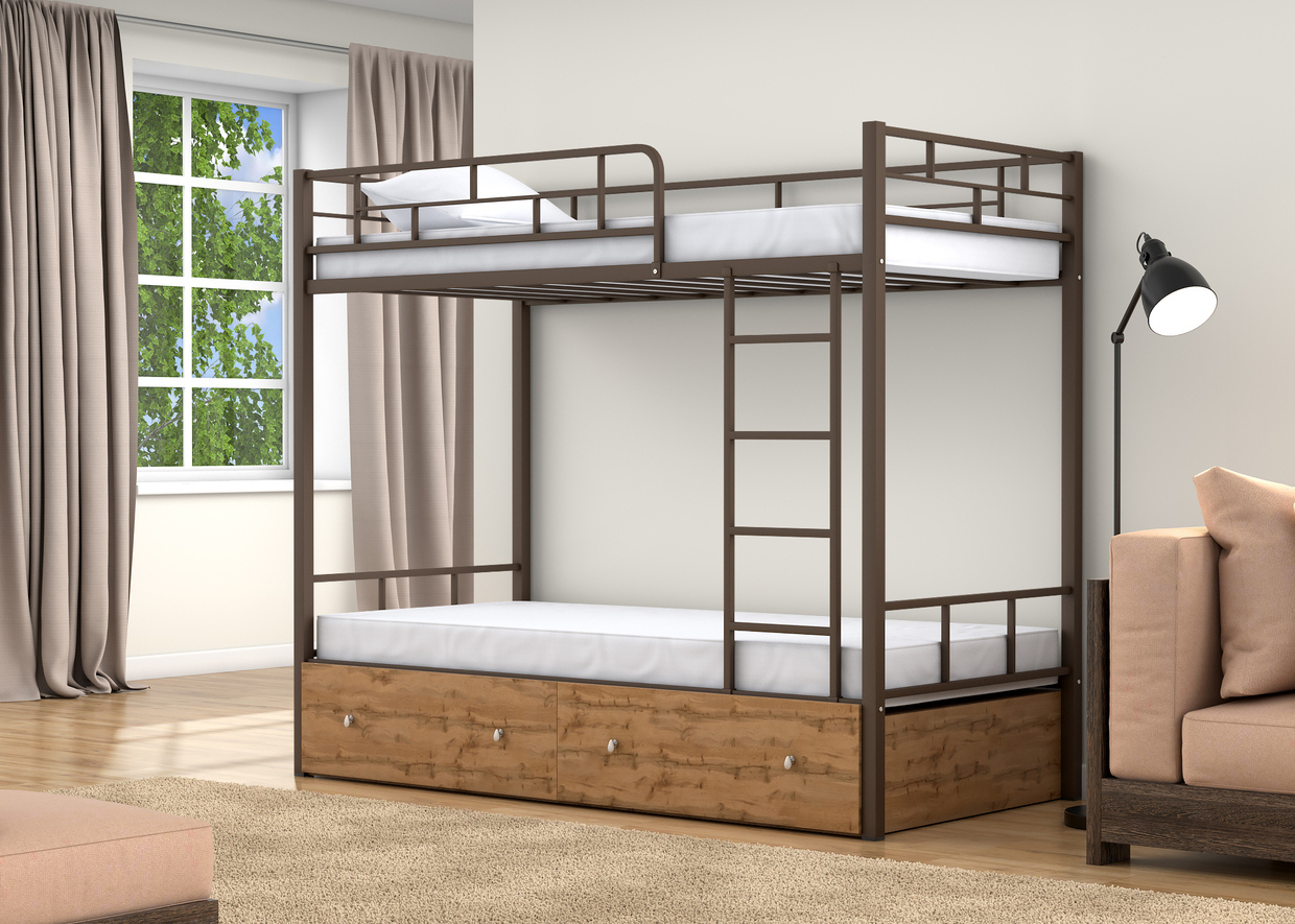 Спальные места 90х190 см., прочный стальной каркас, покрашен безопасной не имеющей запаха порошковой краской. Дополнительно комплектуется выдвижными ящиками и навесной полкой, материал ЛДСП 16 мм.