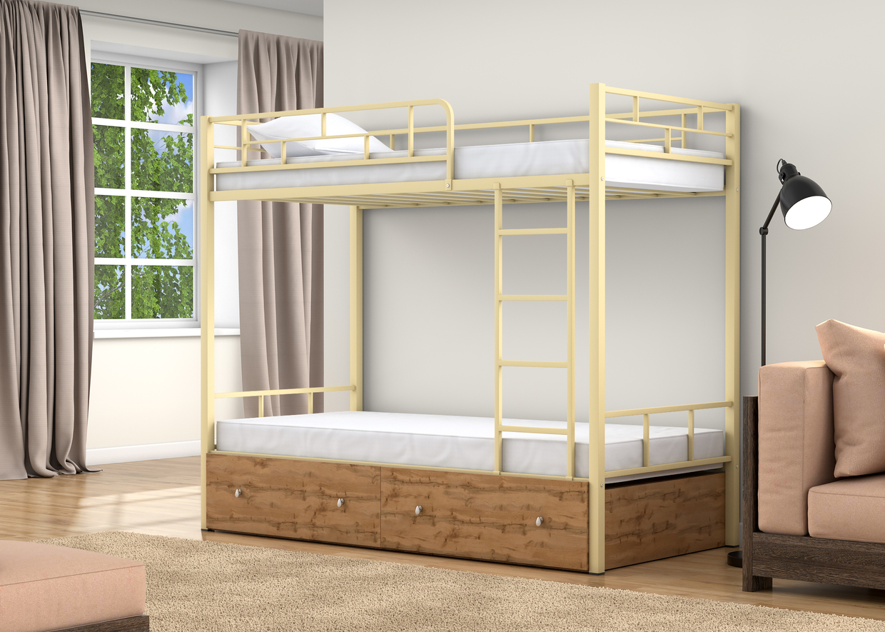 Спальные места 90х190 см., прочный стальной каркас, покрашен безопасной не имеющей запаха порошковой краской. Дополнительно комплектуется выдвижными ящиками и навесной полкой, материал ЛДСП 16 мм.