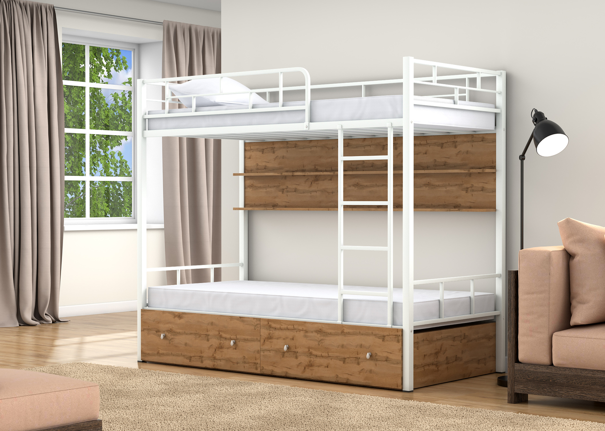 Спальные места 90х190 см., прочный стальной каркас, покрашен безопасной не имеющей запаха порошковой краской. Цвета на выбор: коричневый, черный, слоновая кость. Дополнительно комплектуется выдвижными ящиками и навесной полкой, материал ЛДСП 16 мм., цвета на выбор: дуб молочный или венге.