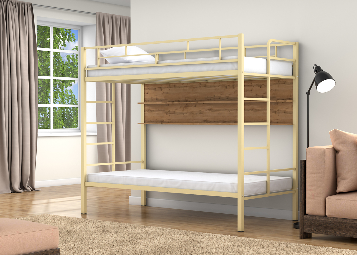 Спальные места 90х190 см., прочный стальной каркас, покрашен безопасной не имеющей запаха порошковой краской. Дополнительно комплектуется выдвижными ящиками и навесной полкой, материал ЛДСП 16 мм.