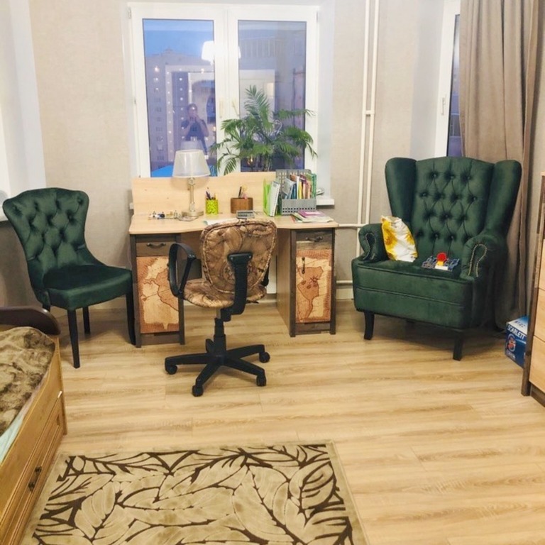 Высокая спинка кресла украшена каретной стяжкой и декорирована пуговицами.