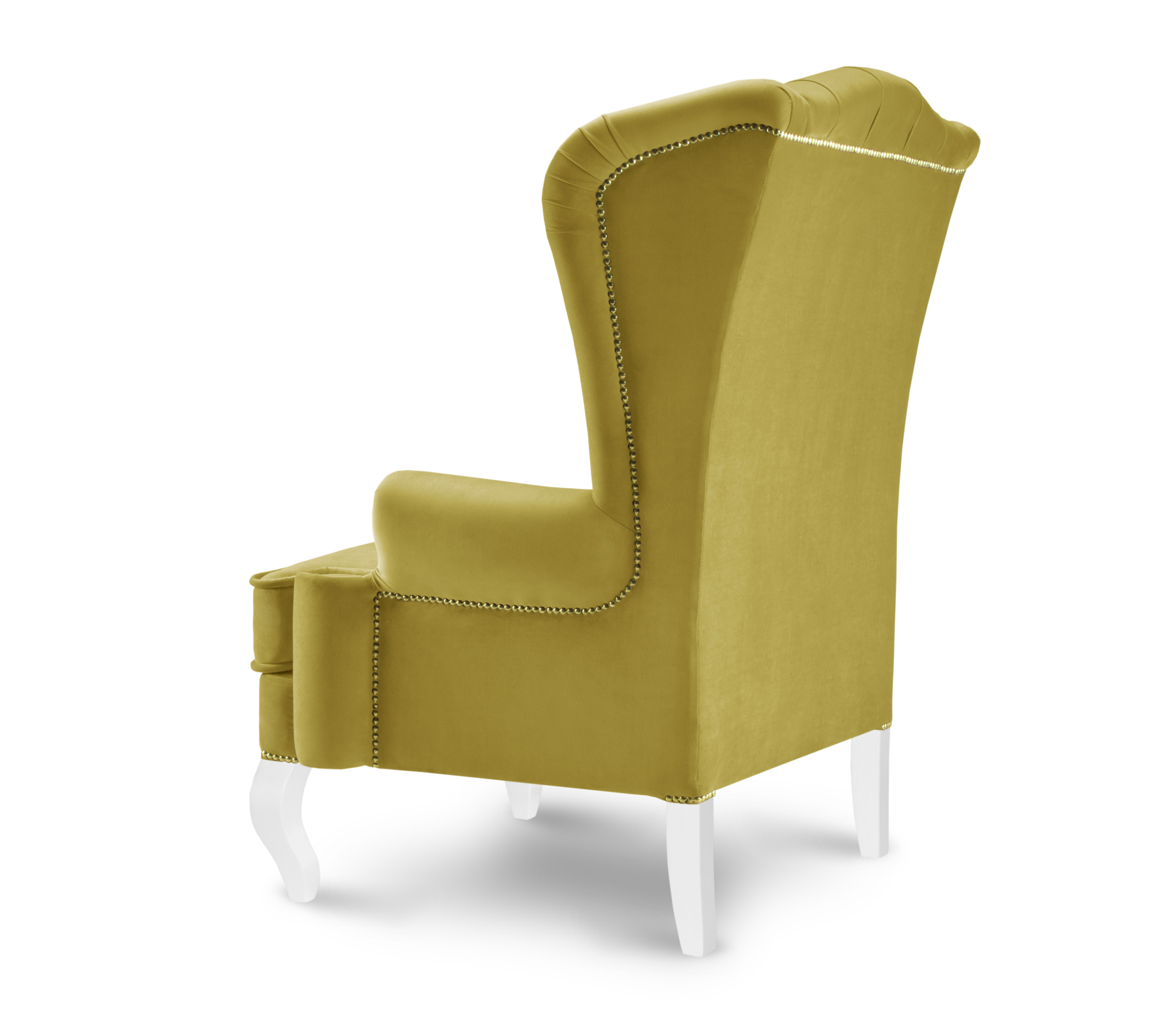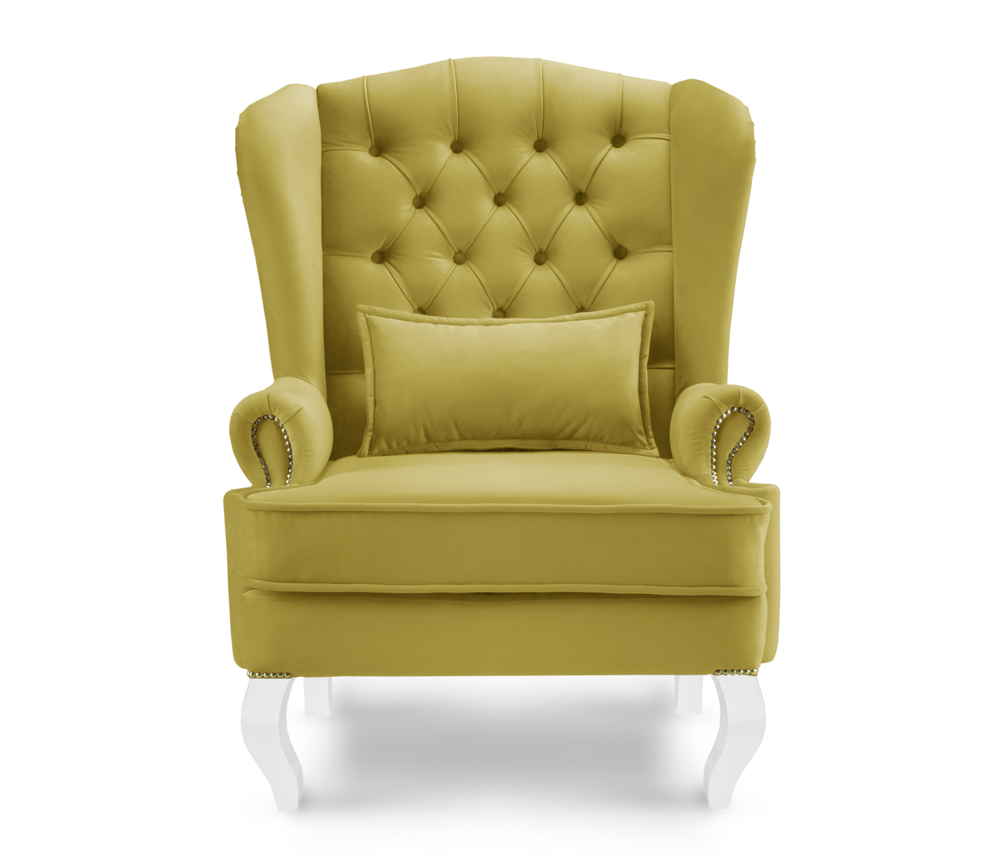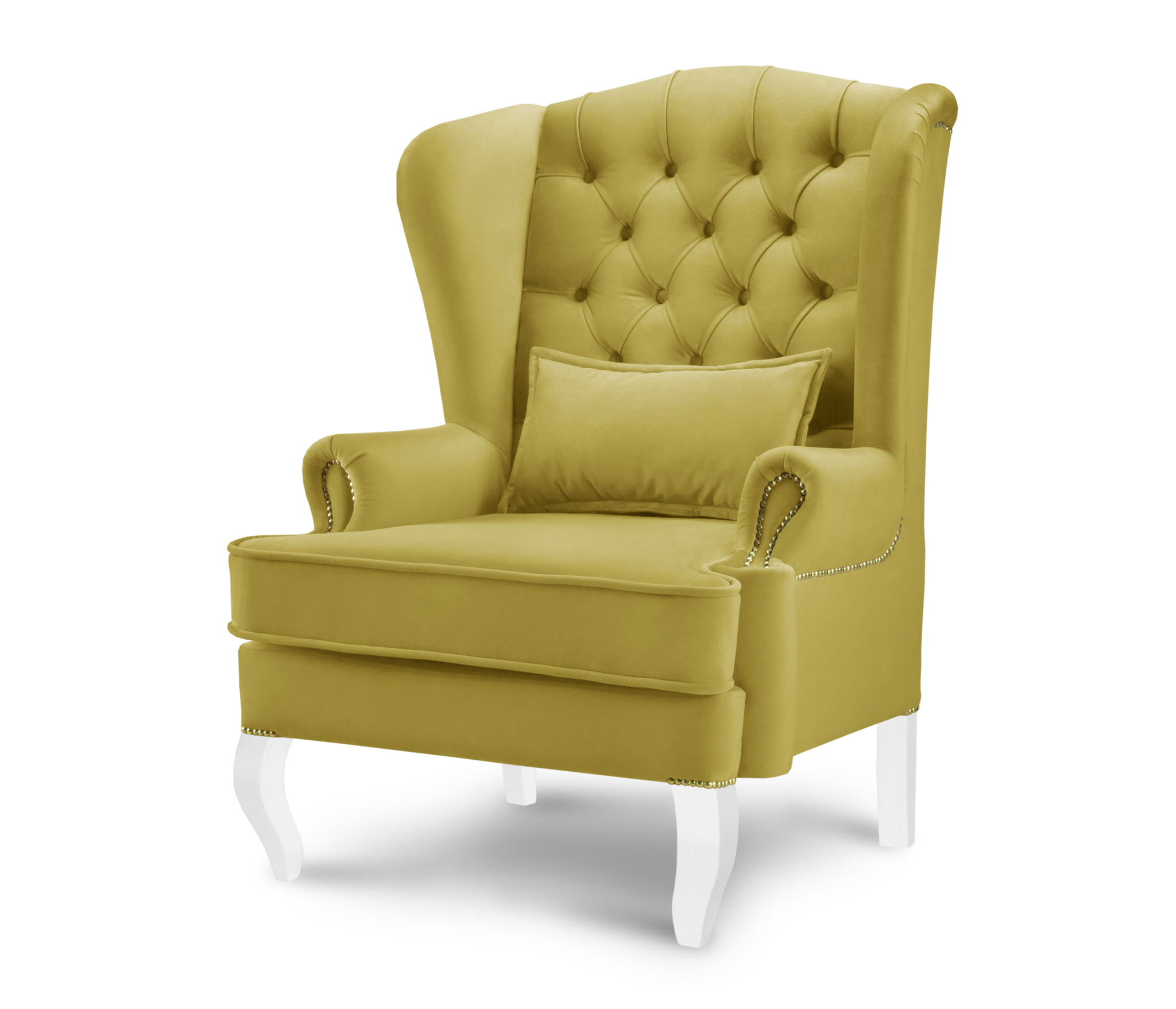 Высокая спинка кресла украшена каретной стяжкой и декорирована пуговицами.