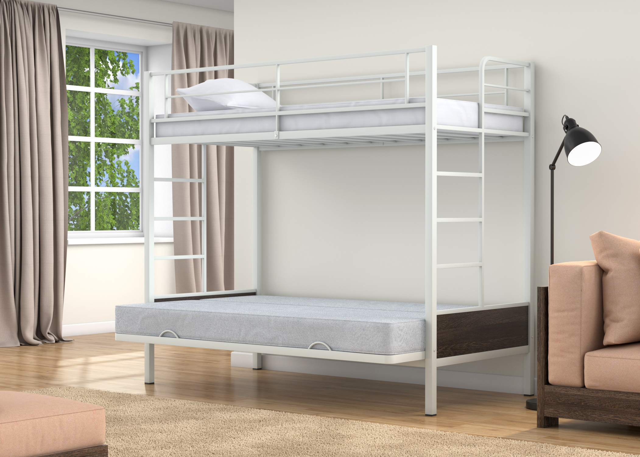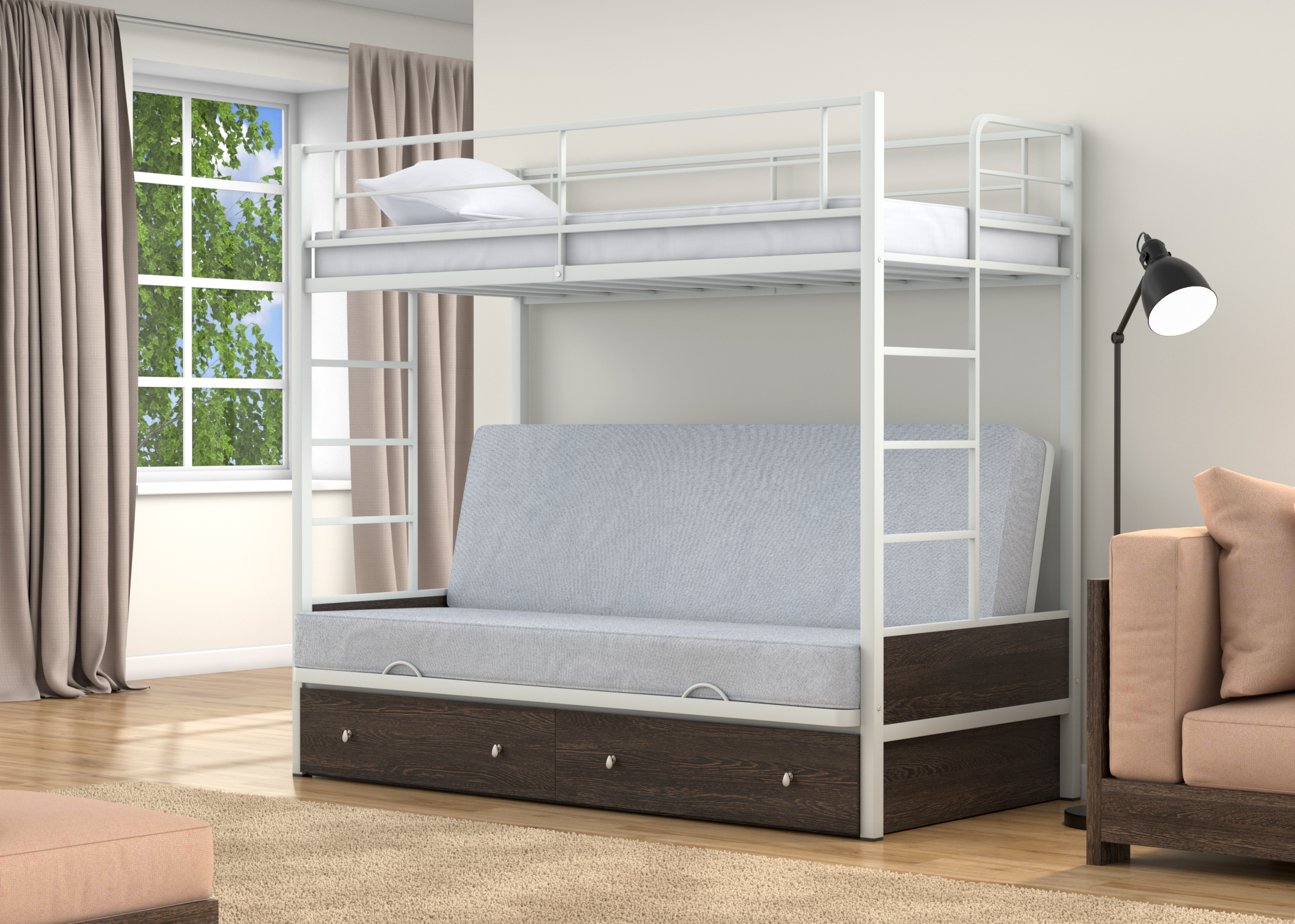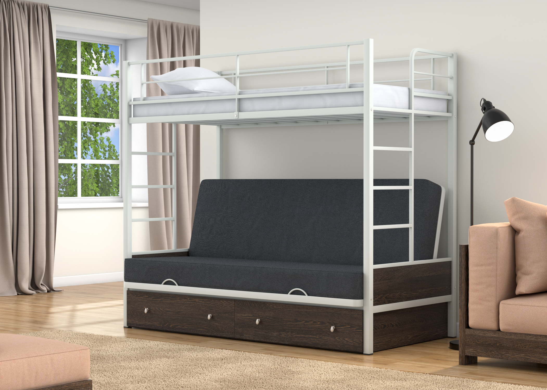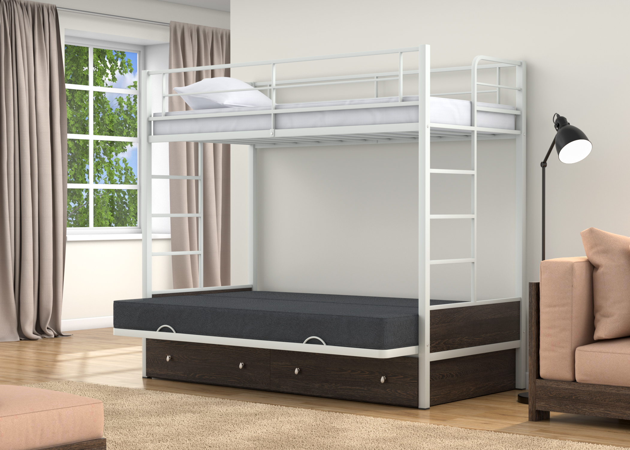 Доброго всем дня! Кроватью очень облегчает жизнь в маленькой комнате, если места мало. Все довольны. Кровать решила проблему с размещением троих человек в одной небольшой комнате. Ну и удобная она. Металл качественный! Ящики вместительные. Рекомендую