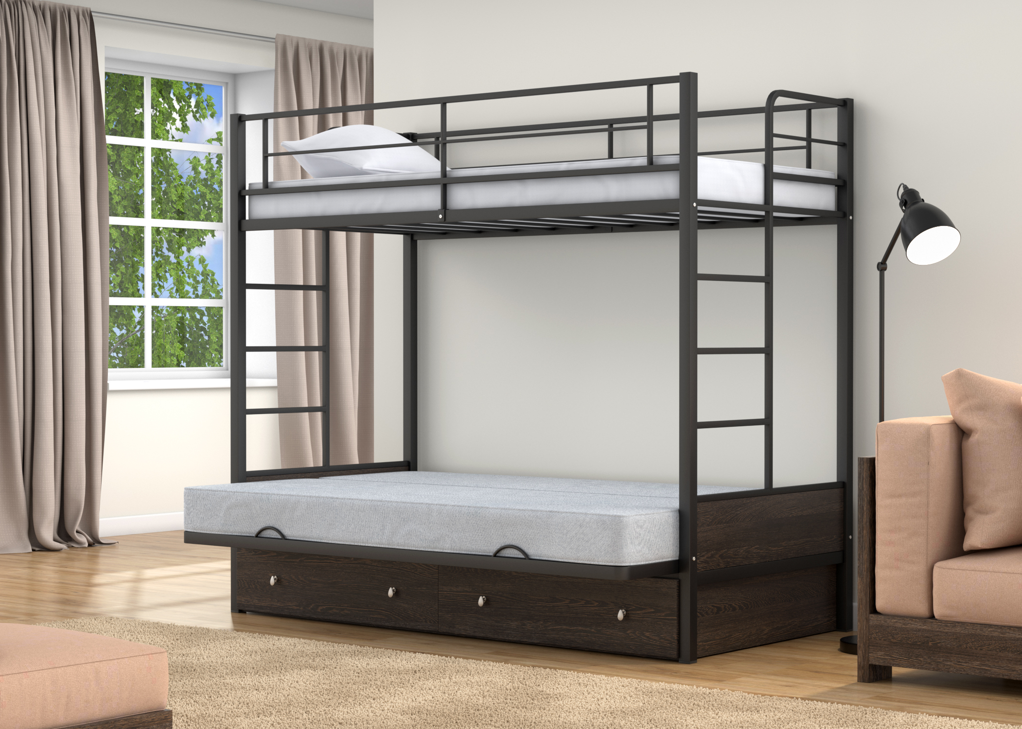 Доброго всем дня! Кроватью очень облегчает жизнь в маленькой комнате, если места мало. Все довольны. Кровать решила проблему с размещением троих человек в одной небольшой комнате. Ну и удобная она. Металл качественный! Ящики вместительные. Рекомендую