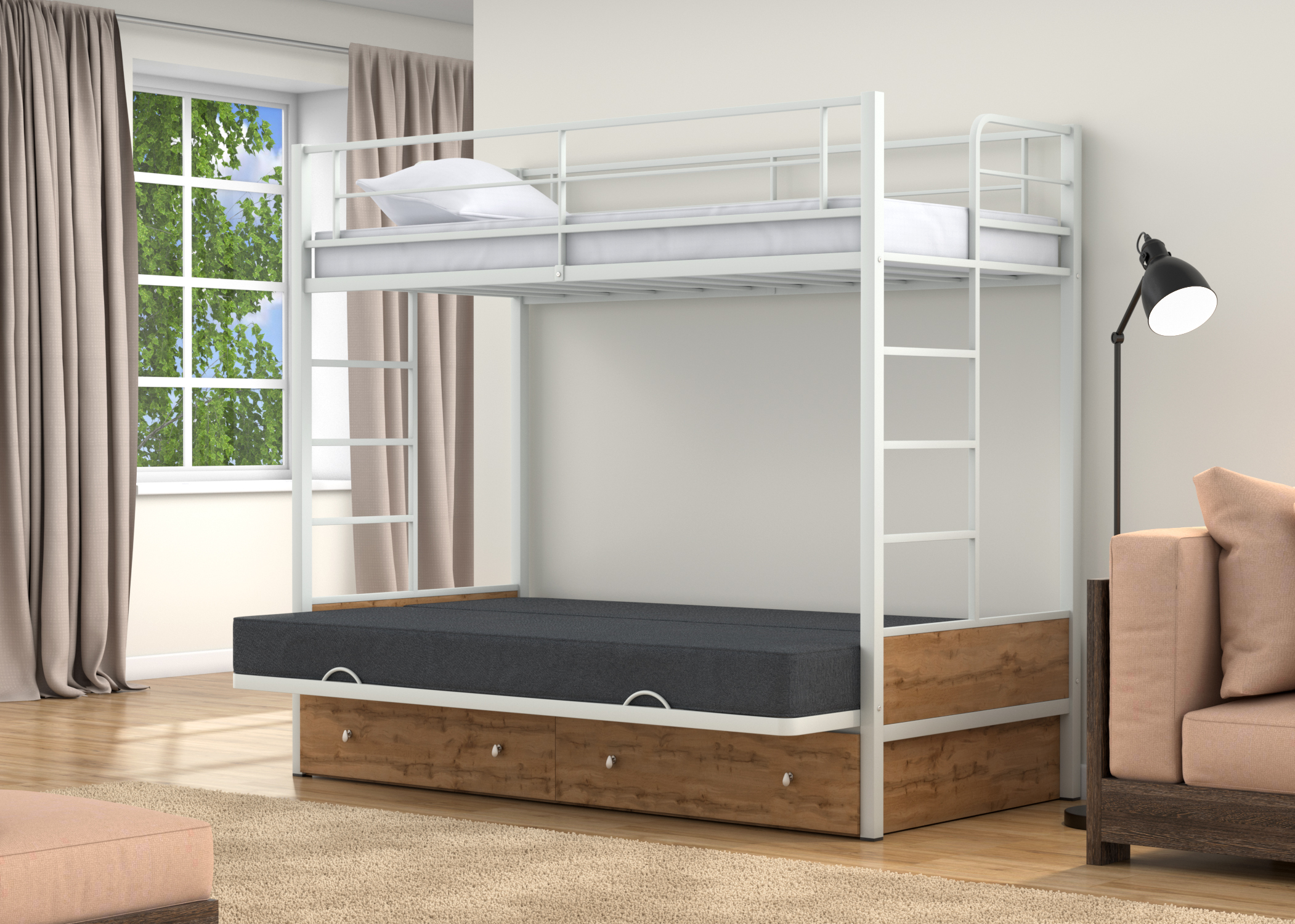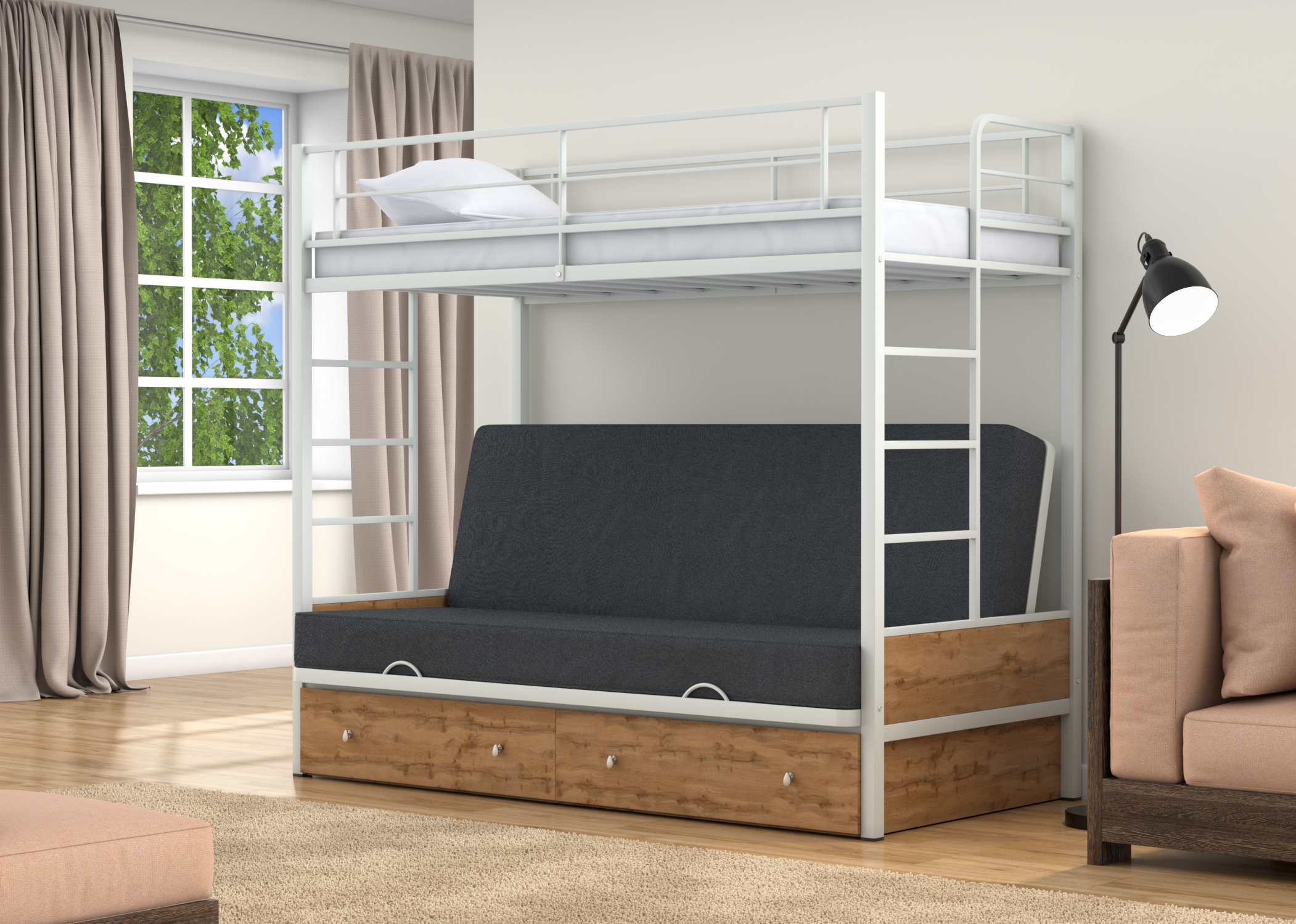 Практичная двухъярусная кровать. Порадовала быстрая доставка, привезли уже на следующий день. Сборка в день доставки. Надежный механизм дивана.