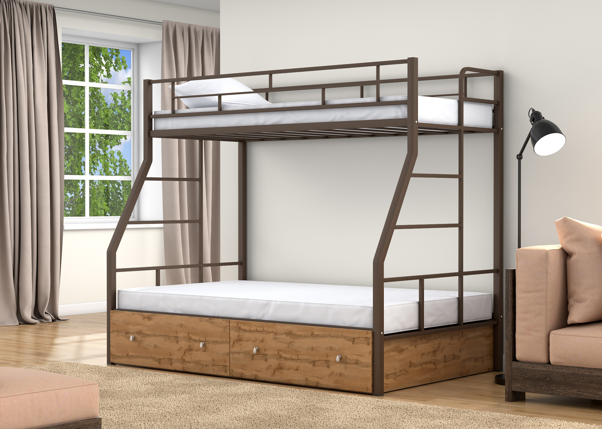 Двухъярусная кровать Раута Твист, спальные места 90х190 см. и 120х190 см., прочный стальной каркас, покрашен безопасной не имеющей запаха порошковой краской. Цвета на выбор: коричневый, черный, слоновая кость. Дополнительно комплектуется выдвижными ящиками и навесной полкой, материал ЛДСП 16 мм., цвета на выбор: дуб молочный или венге.