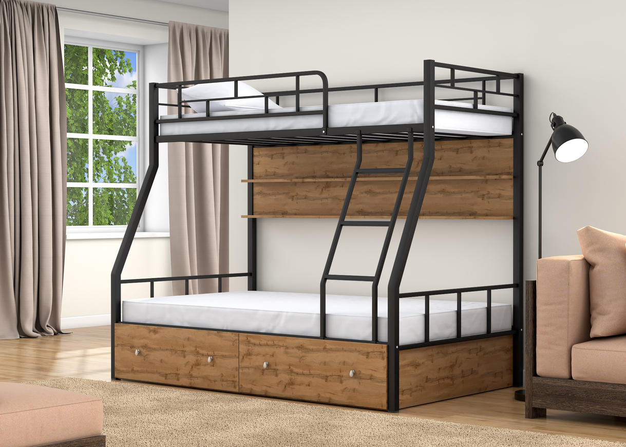 Двухъярусная кровать Раута , спальные места 90х190 см. и 120х190 см., прочный стальной каркас, покрашен безопасной не имеющей запаха порошковой краской. Цвета на выбор: коричневый, черный, слоновая кость. Дополнительно комплектуется выдвижными ящиками и навесной полкой, материал ЛДСП 16 мм., цвета на выбор: дуб молочный или венге.