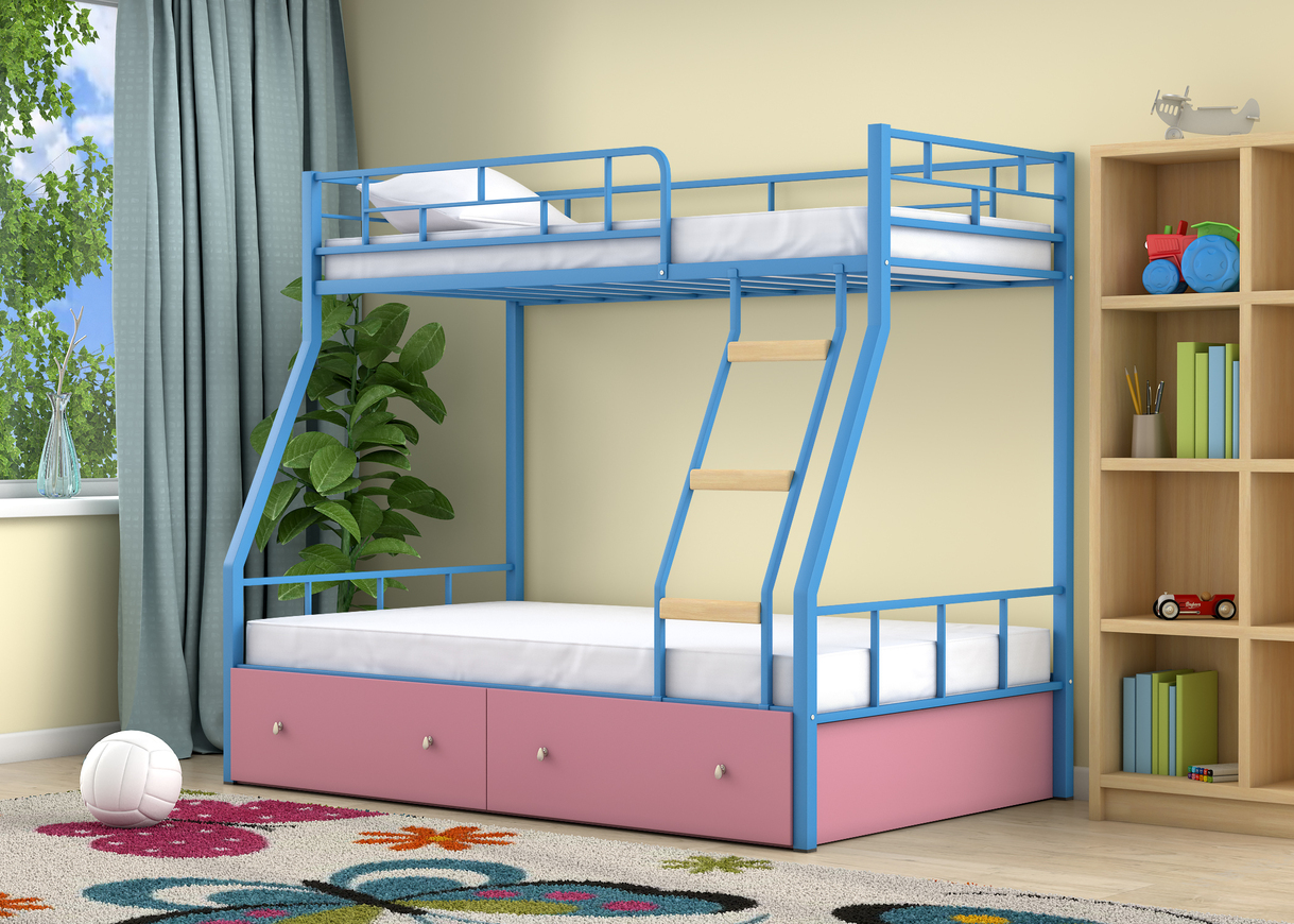Двухъярусная кровать Радуга в комплекте с деревянными ступенями.Спальные места 90х190 см. и 120х190 см., прочный стальной каркас, покрашен безопасной не имеющей запаха порошковой краской. Цвета на выбор: розовый, голубой, белый, зеленый. Выдвижные ящики и навесная полка сделаны из ЛДСП 16 мм., цвета на выбор: дуб молочный, венге, бежевый, голубой, зеленый, розовый, белый. Доставка по Москве и области 2-3 дня.