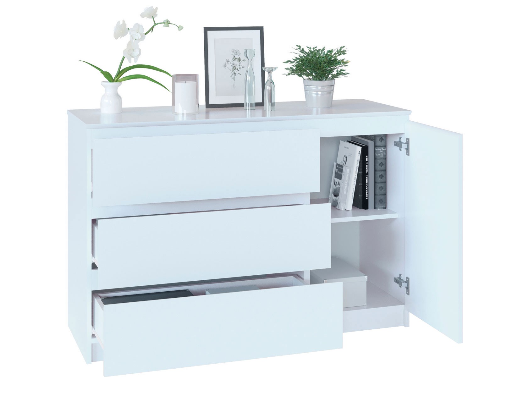 удобное хранение — три вместительных выдвижных ящика дополнены распашным отделением с полочкой, а на широкой столешнице поместится небольшой телевизор, аксессуары, предметы декора;