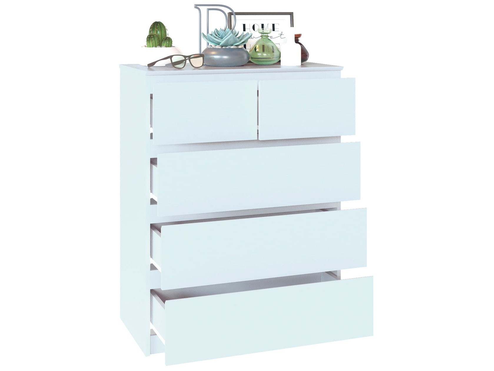 Для изготовления комода используется ЛДСП толщиной 16 мм. Задняя стенка и дно ящиков произведены из ДВП. Модель оснащена роликовыми направляющими.