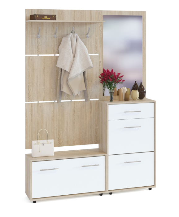 Широкая прихожая, состоящая из двух тумб для обуви, вешалки и зеркальной панели. Двери тумбы оснащены откидывающимся механизмом со специальными полками для размещения обуви, который обеспечивает удобство хранения и легкий доступ к необходимой паре обуви. Вешалка имеет полку для головных уборов.