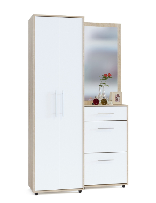 Компактный гарнитур с зеркалом для маленькой прихожей. В шкафу есть выдвижная штанга и две полки. Тумба для обуви имеет два отделения и выдвижной ящик для перчаток, ключей и аксессуаров.
