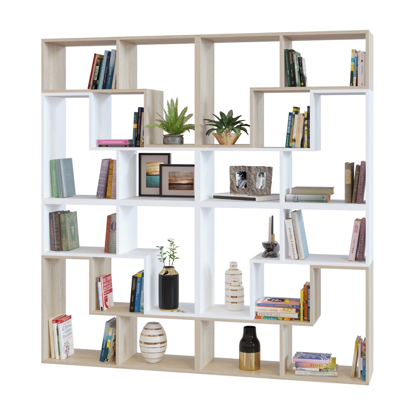 Собрать представленный стеллаж можно из модульных элементов четырех цветов: Венге, Беленый дуб, Белый и Дуб сонома: в однотонном варианте или комбинируя цвета. При заказе требуется указать сколько элементов какого цвета понадобится для создания уникального стеллажа.