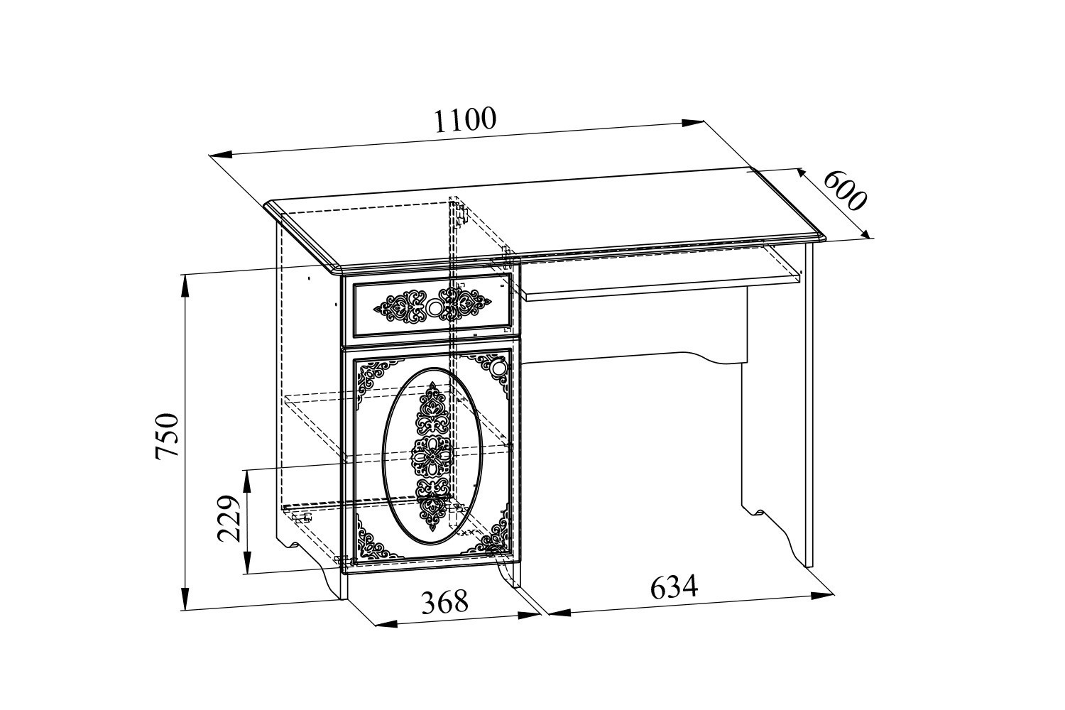 Письменный стол с выдвижным ящиком и тумбой. Размер столешницы 1100 мм * 600 мм. Может использоваться, как стол для компьютера. Снабжен выдвигающейся панелью 300 мм * 600 мм для клавиатуры.