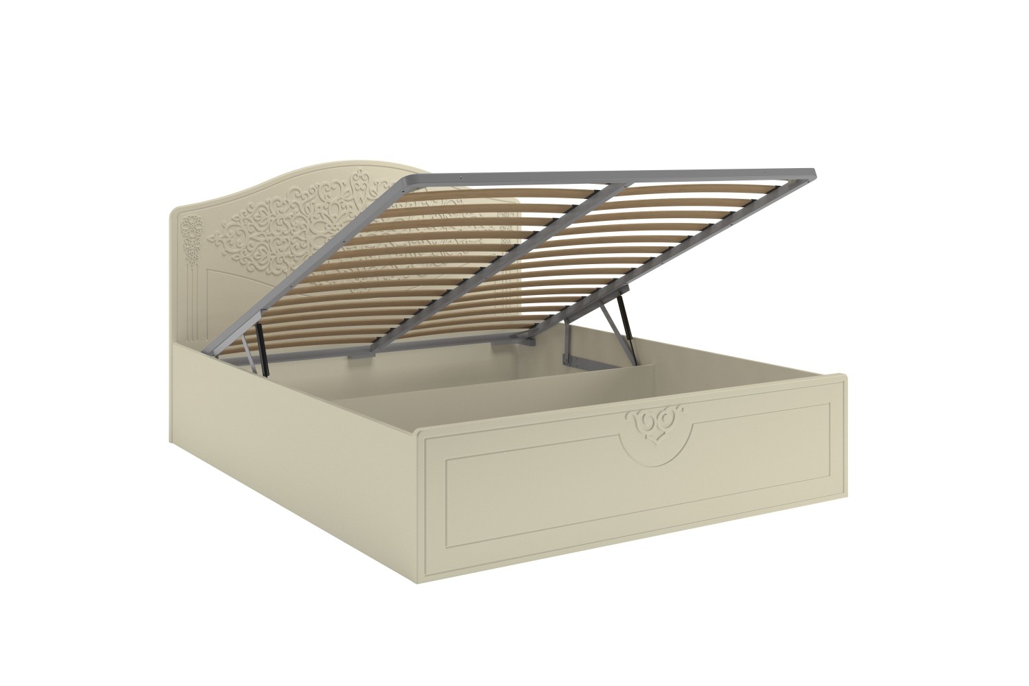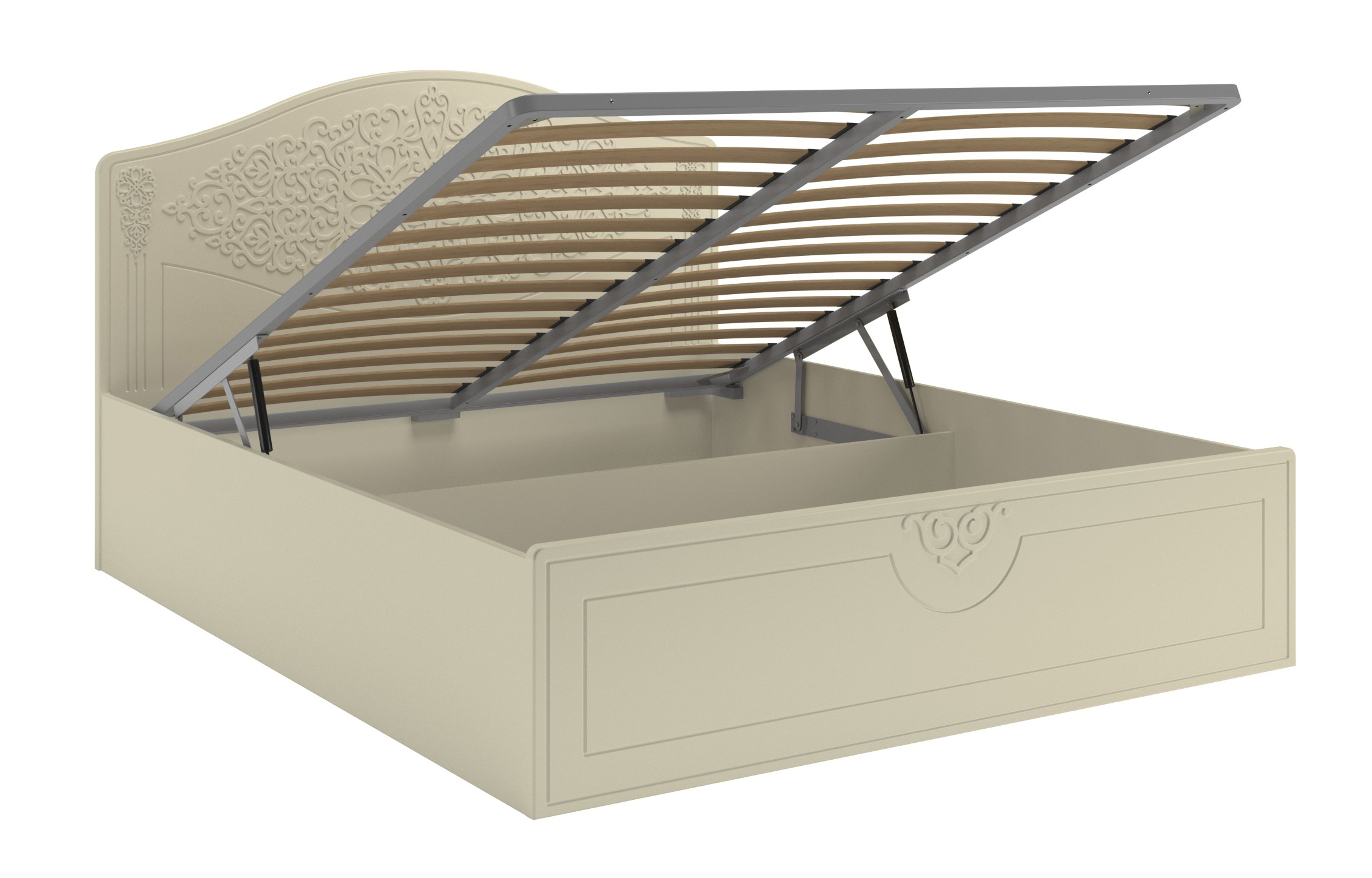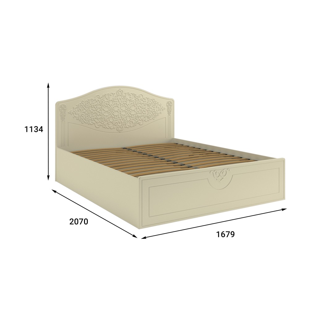 Кровать оснащена подъемным механизмом, обеспечивающим доступ в короб для хранения постельного белья. С двуспальной кроватью идеально подходит банкетка АС-34 для размещения рядом (в ногах).